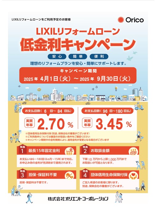 2025.06.08 LIXILリフォームローン低金利キャンペーン中! 外構工事をお考えの方、この機会にぜひ、お気軽にご相談ください。 ライフスタイルに合わせて、ずっと快適に暮らせるような外構やお庭を一緒に考えましょう!特長①実質年率 2.70%(84回払いまでの場合)(96回~180回払いの場合は3.45%)②上限1,000万円まで③担保・保証料不要④団体信用生命保険付保(保険会社審査要)<提携ローン会社の審査要> 前の記事
