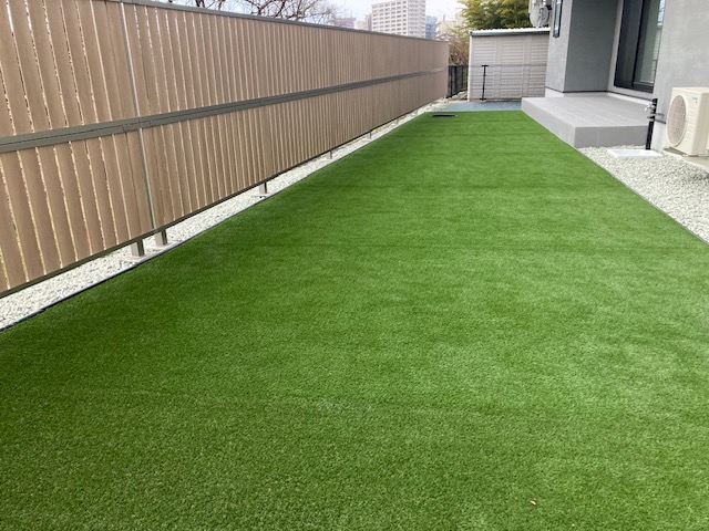 明るい木目のフェンスと人工芝が爽やかな印象のプライベート空間に仕上がりました!