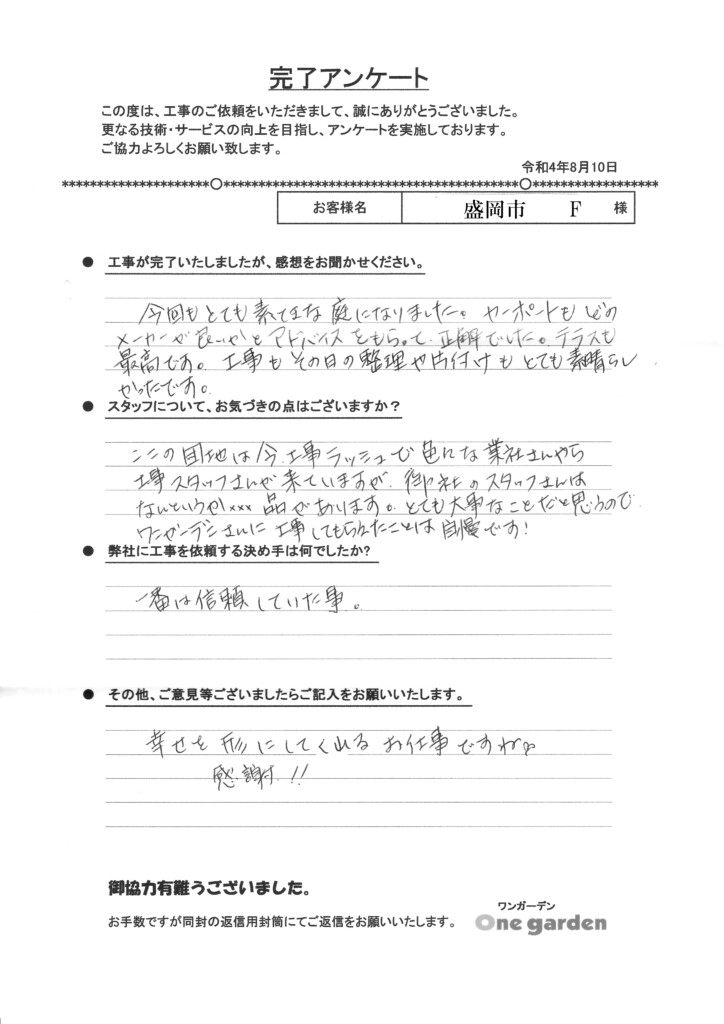 嬉しいお言葉をたくさんいただきありがとうございます。お庭でご家族の楽しい時間が増えると嬉しいです。今後ともよろしくお願いいたします。