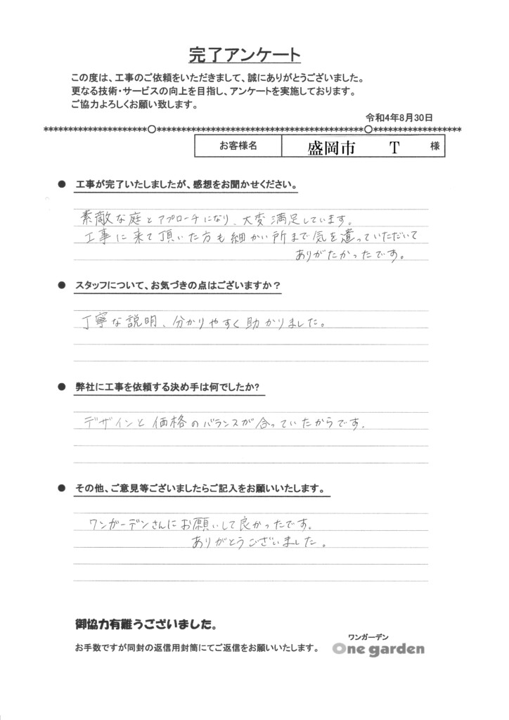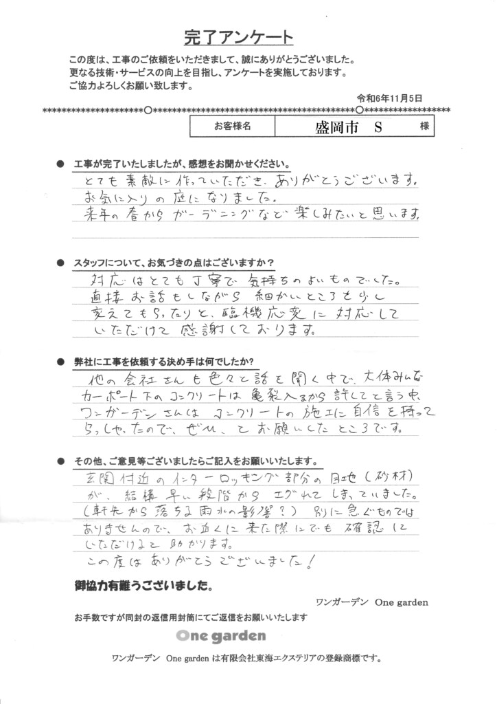 他の会社さんも色々と話を聞く中で、大体みんなカーポートしたのコンクリートは亀裂が入るから許してくれという中、ワンガーデンさんはコンクリートの施工に自信を持ってらっしゃたので、ぜひ、とお願いしたところです。