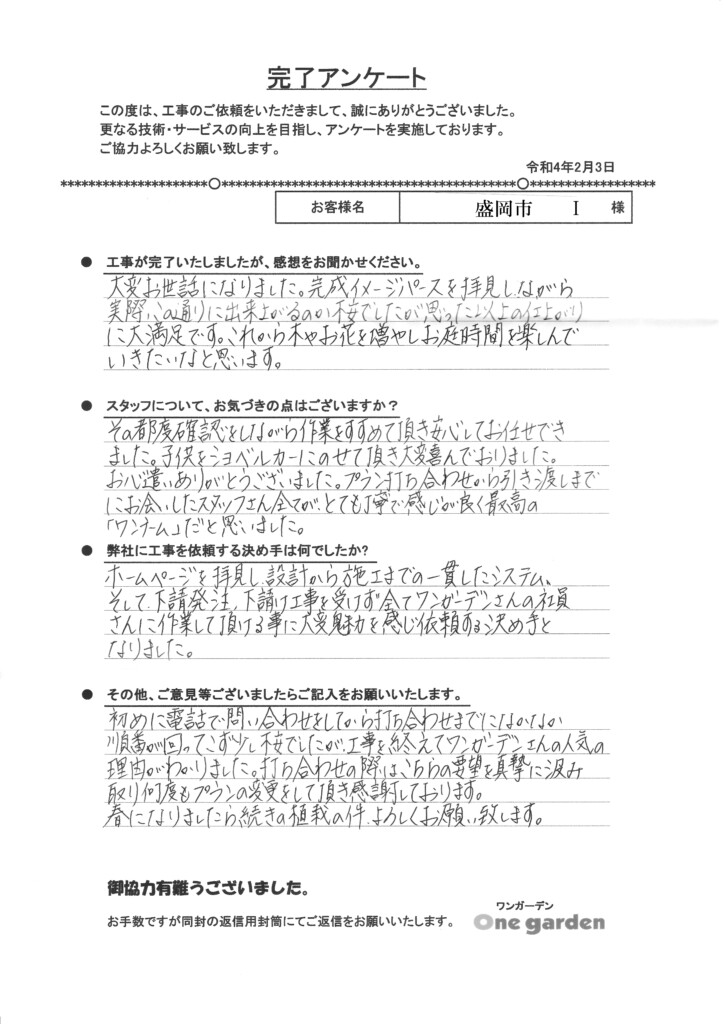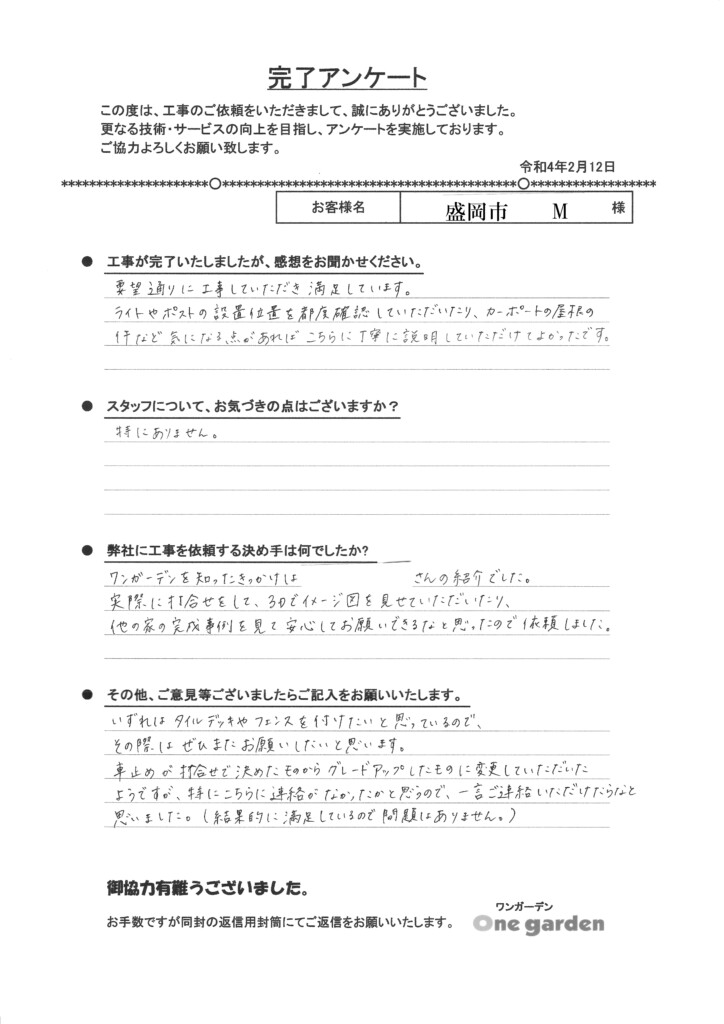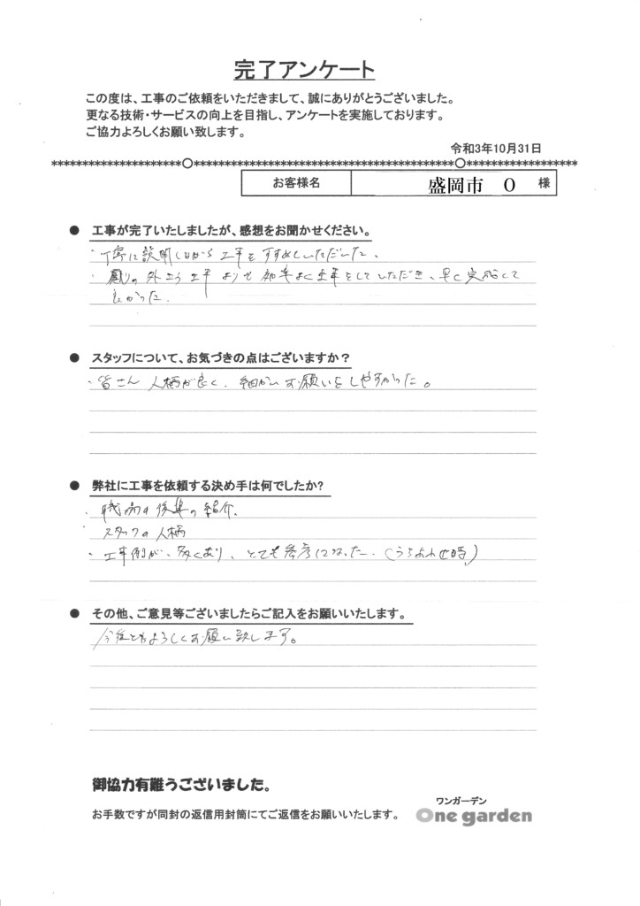 ・周りの外構工事よりも効率よく仕事をしていただき、早く完成して良かった。