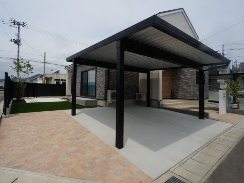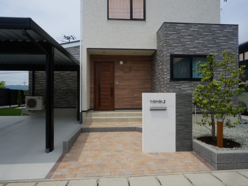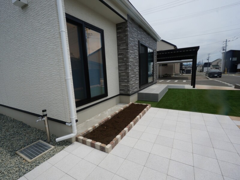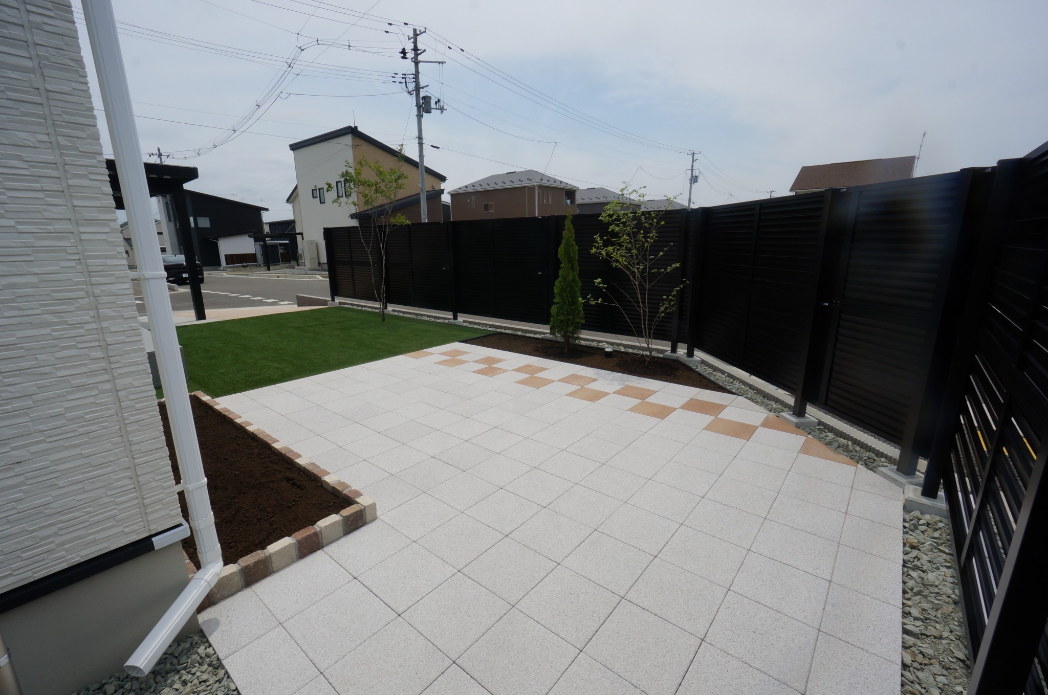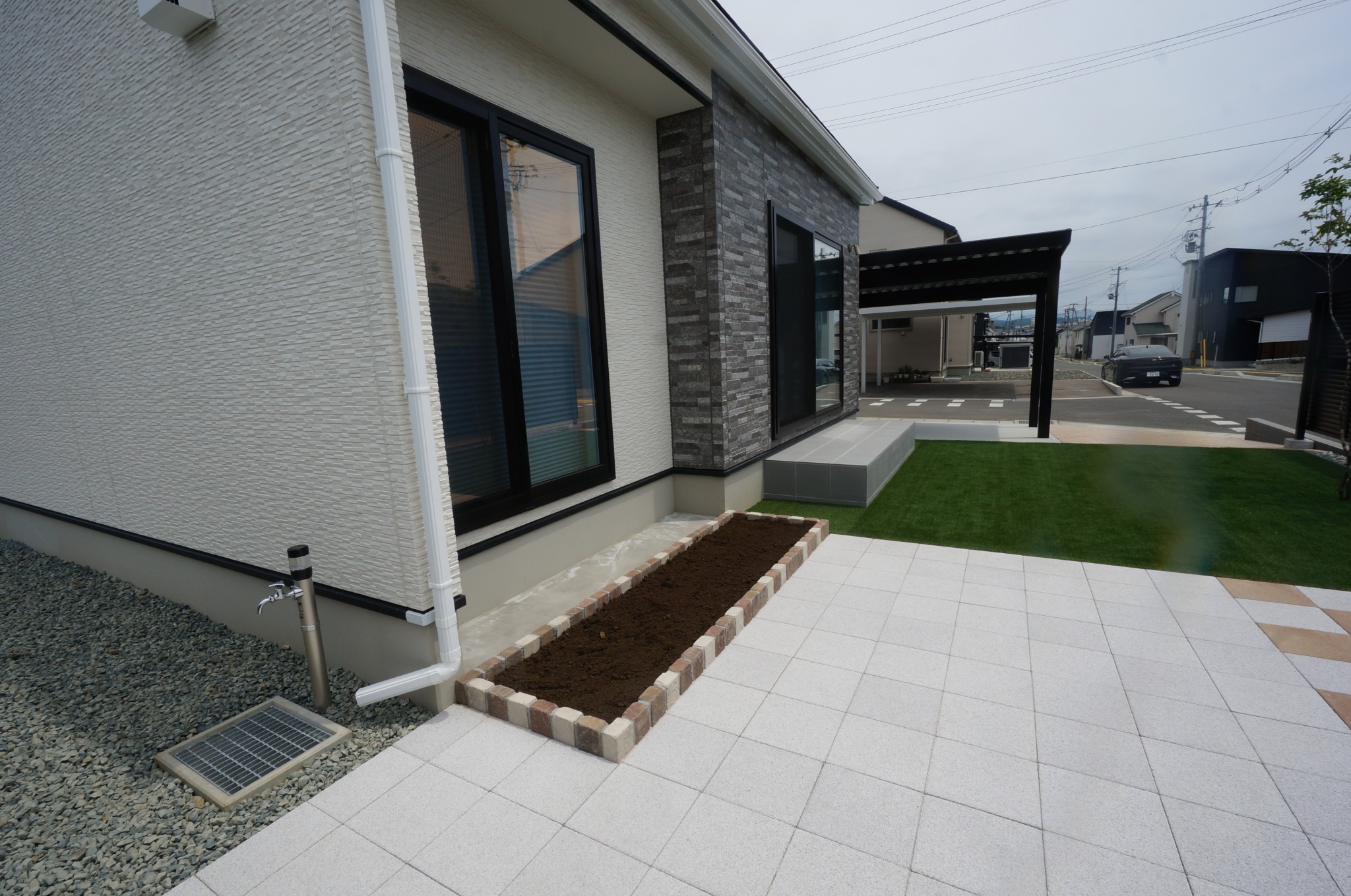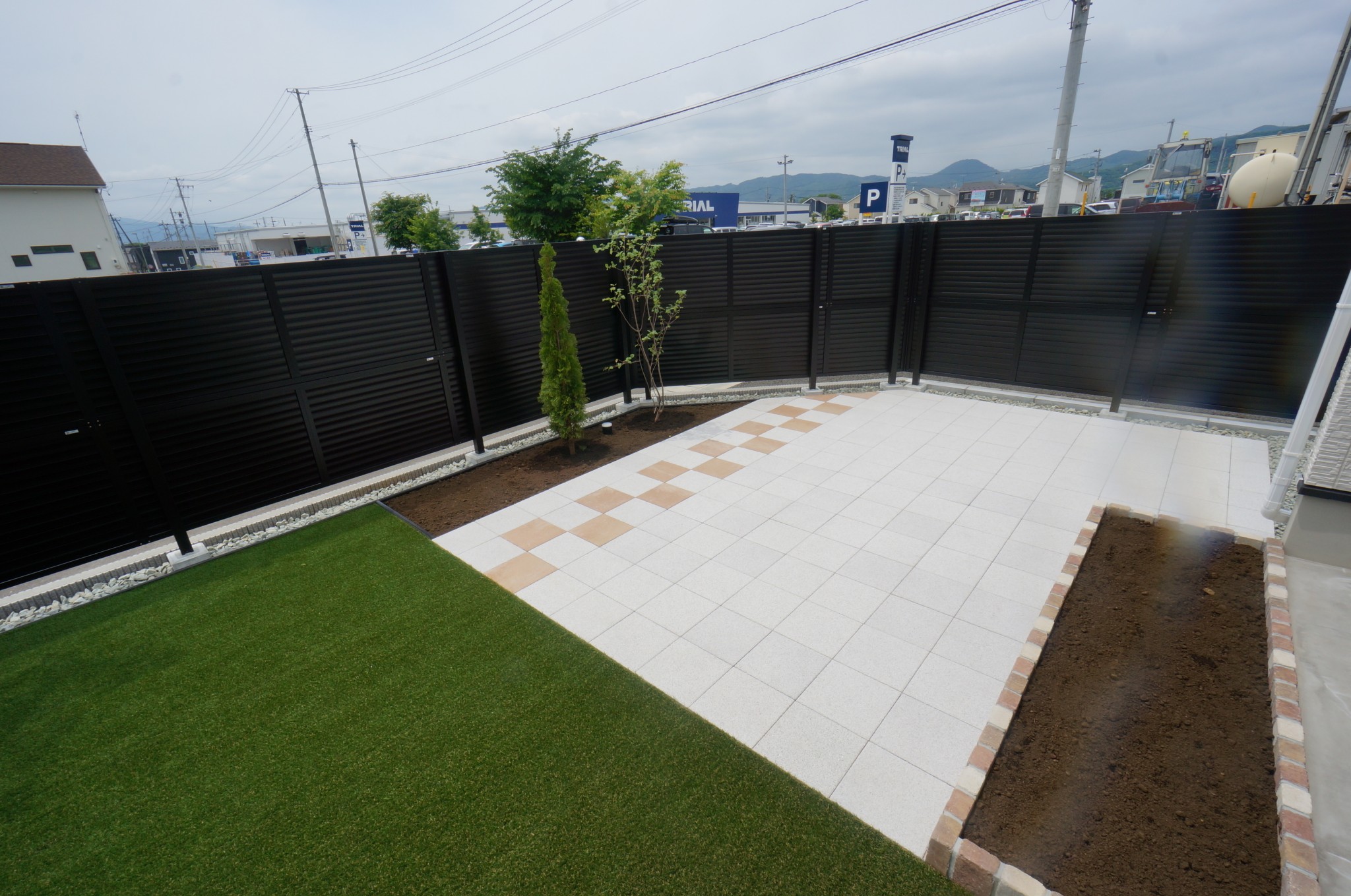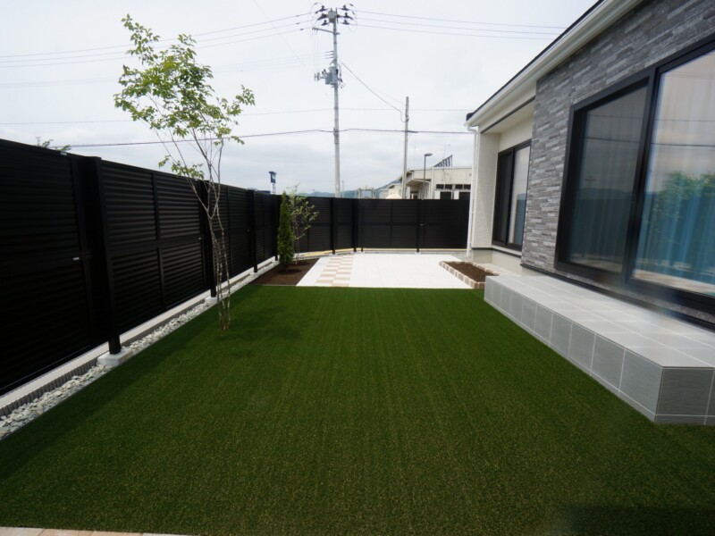 広い人工芝と広いテラスで奥行感もあり清々しい空間になりました。すっきりとクールな印象の中に所々にかわいらしい色使いでさりげなくおしゃれなエクステリアになりました。