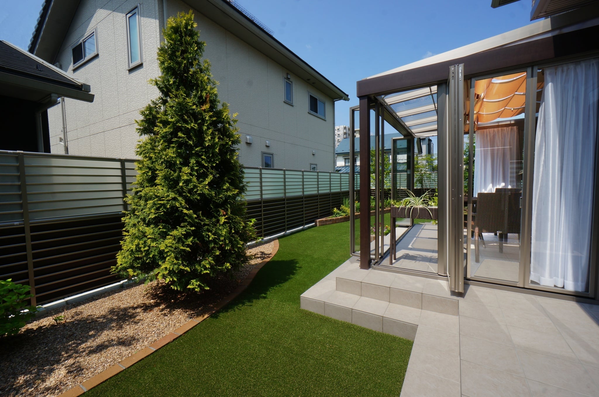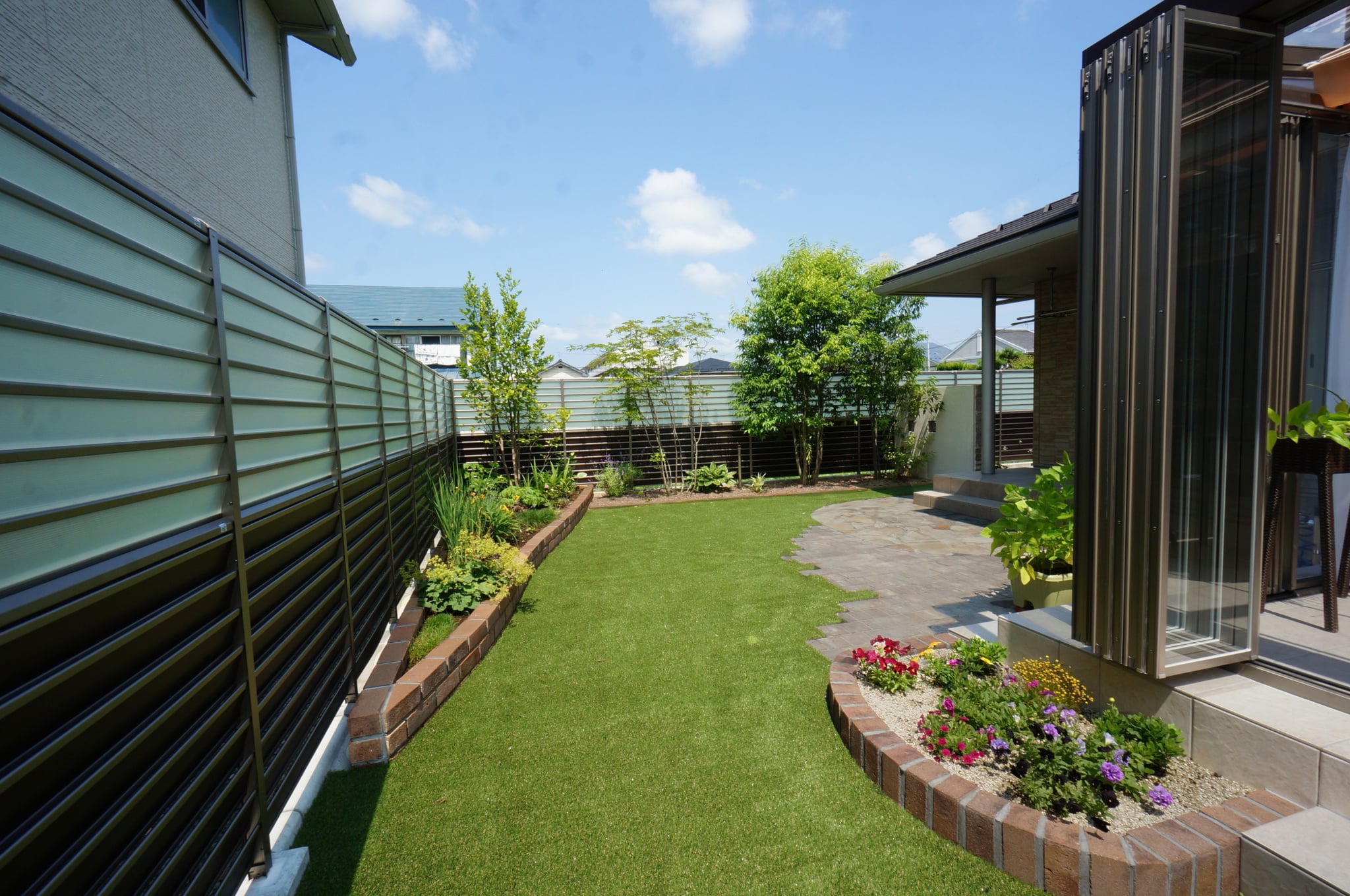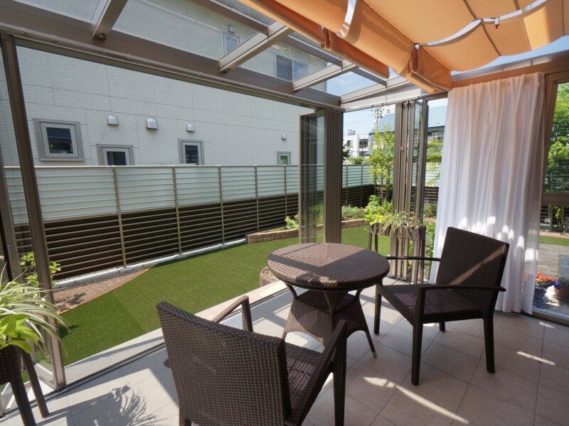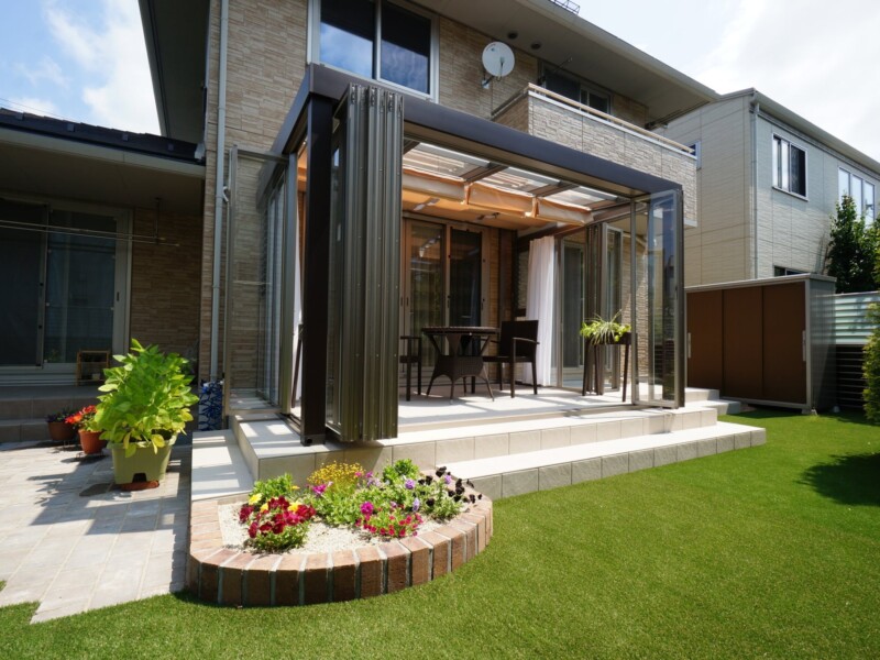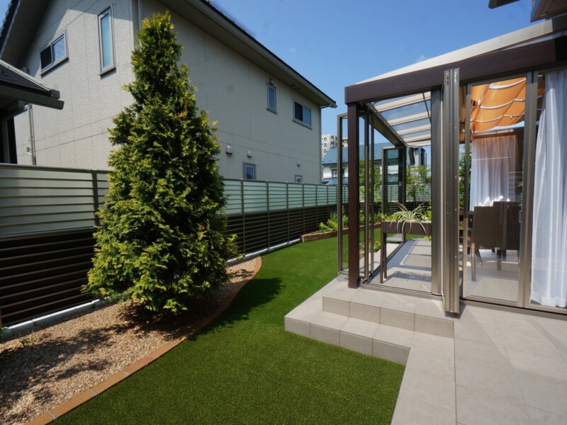 リフォーム・穏やかに楽しむガーデンライフ オアシスタイルテラスプライベート空間⼈⼯芝外構盛岡広々とした庭目隠しフェンス 所在地 盛岡市 穏やかな時間が流れるガーデン 晴天の日はシェード(日よけ)をひいて、曇りの日はたたんで日の光をたくさん取り入れてお洗濯を干したり、お茶の時間を楽しんだり、大活躍です。玄関前からのぞくデザインウール(飾り壁)は、お庭とエントラスをおしゃれに区切り、さりげなく目隠しの役割をしています。 DATA ガーデンルーム ジーマ (LIXIL) タイルテラス コンテⅡ (LIXIL) インターロッキング パエリア (エスビック) レンガ花壇 ロイヤルパインブリック (エスビック) その他施工実例 南国風リゾートガーデン 所在地 盛岡市 青と白のリゾートガーデン 所在地 盛岡市 リフォーム・緑鮮やかなグリーンガーデン 所在地 北上市