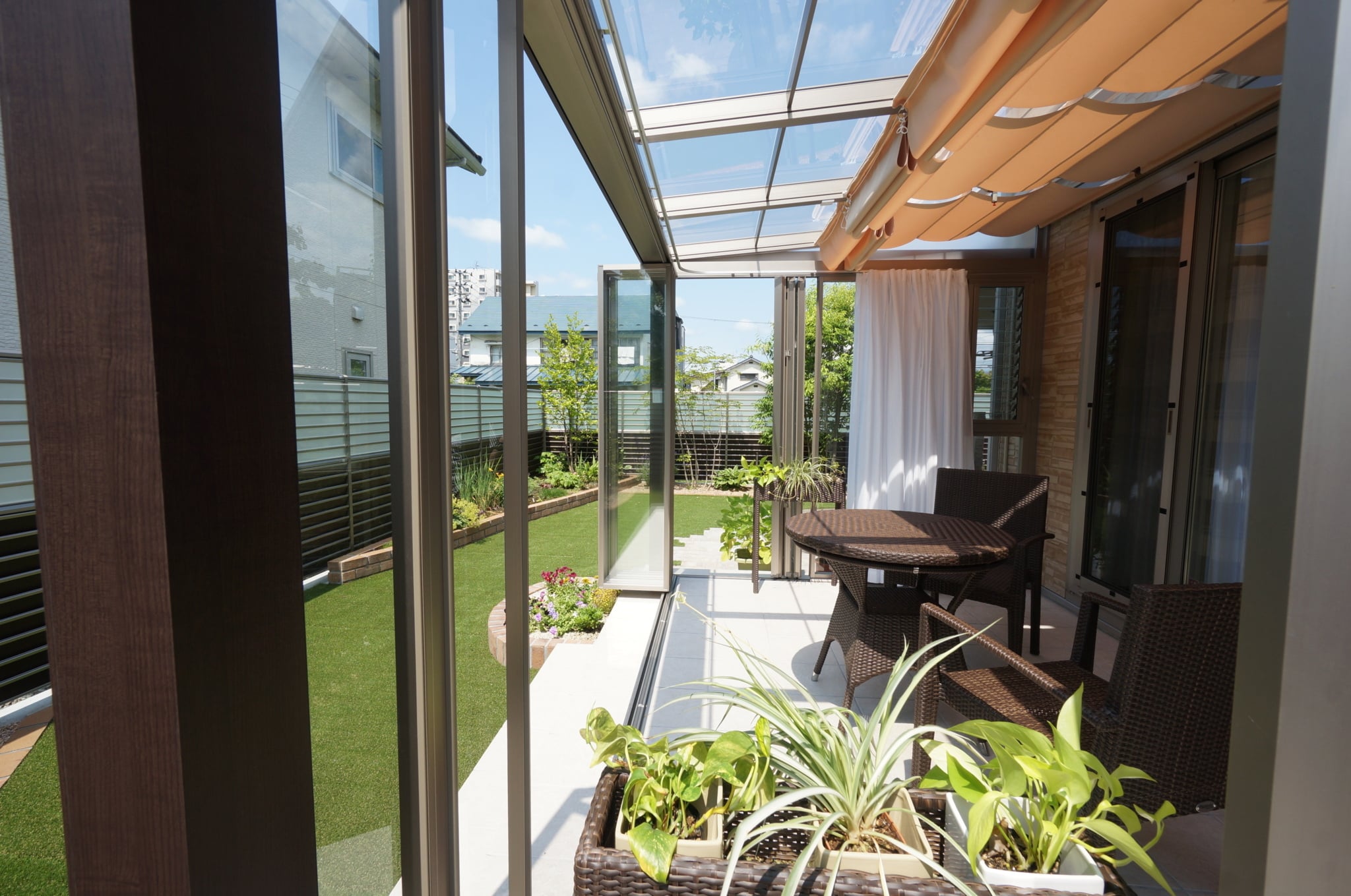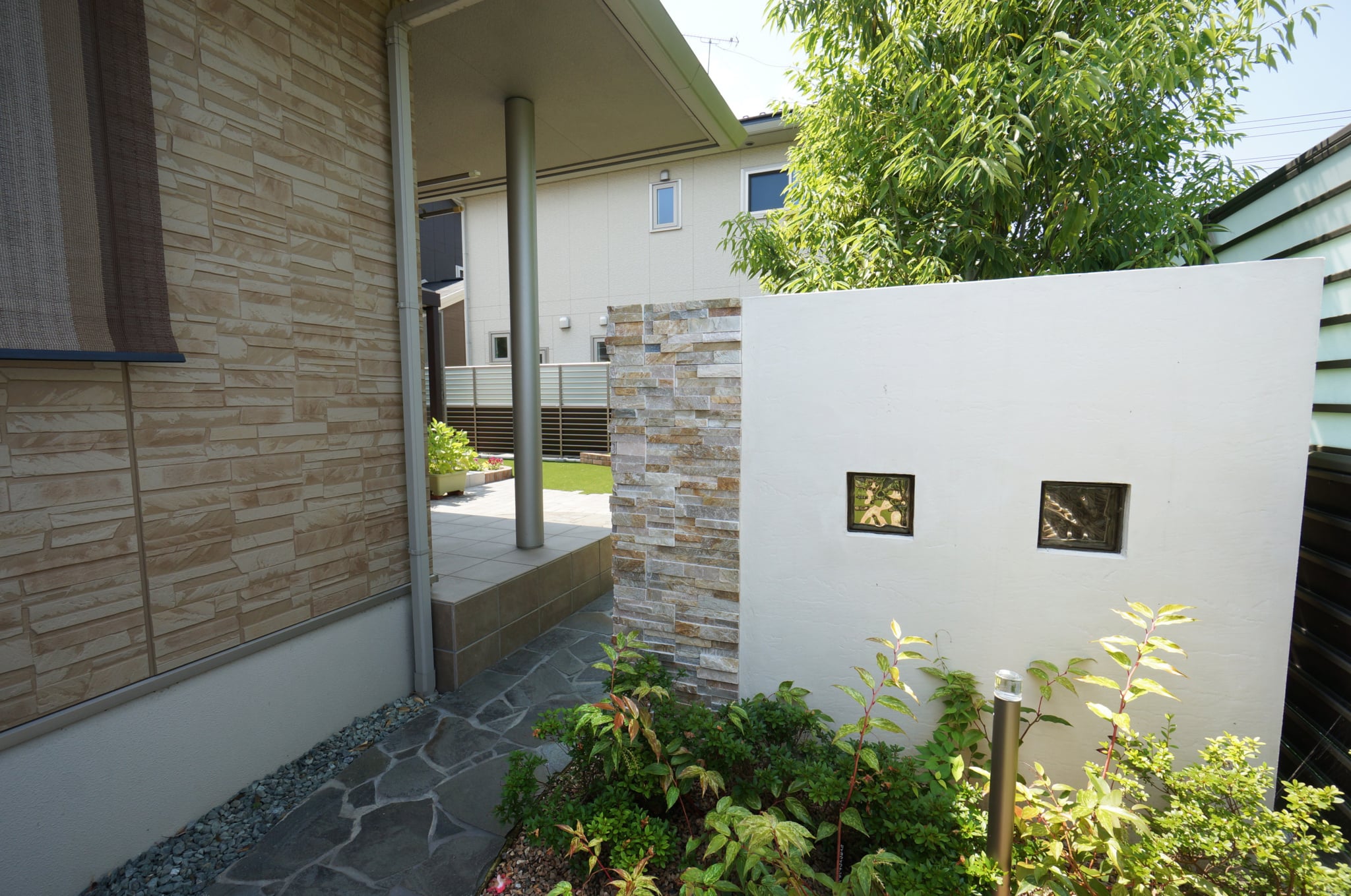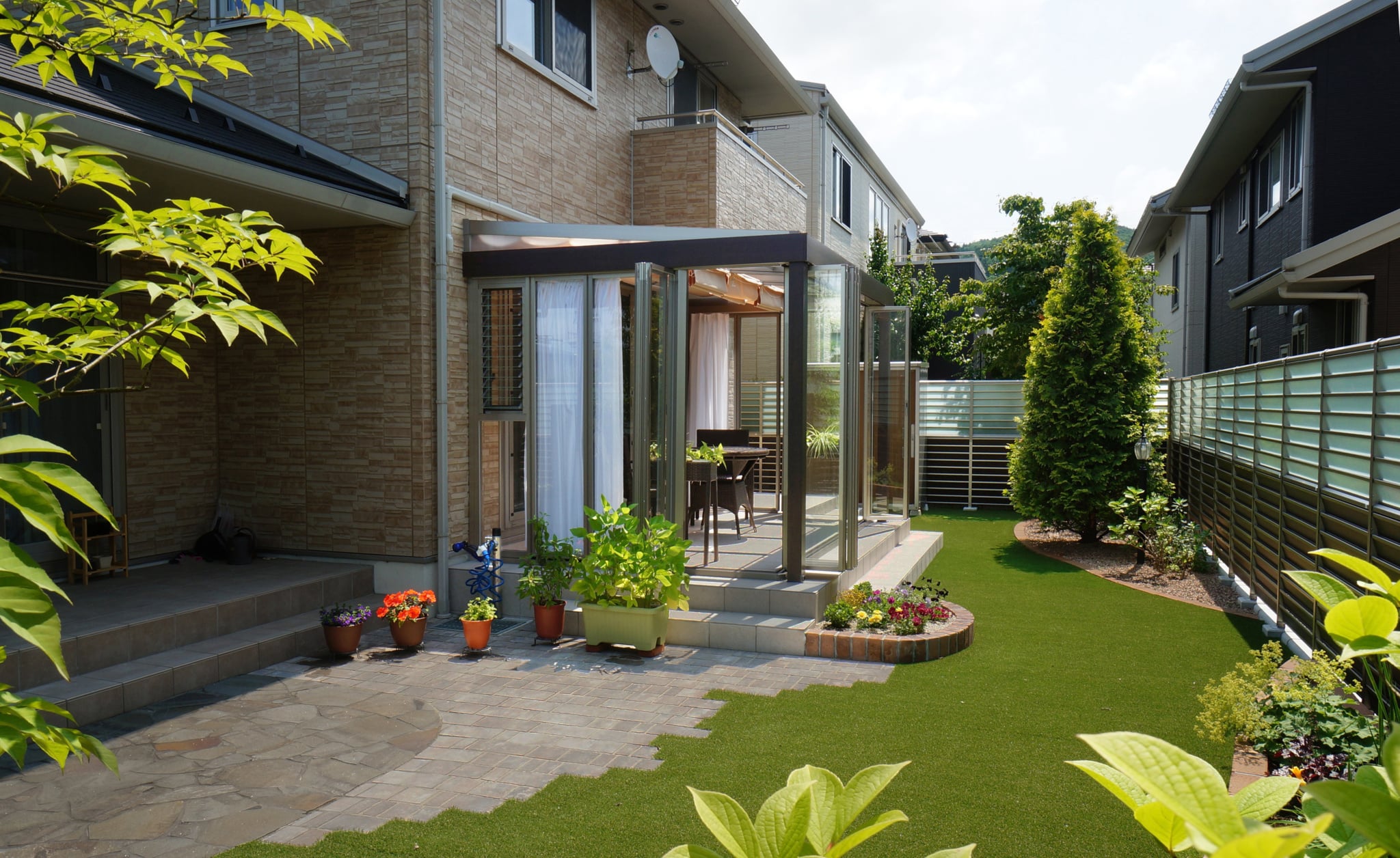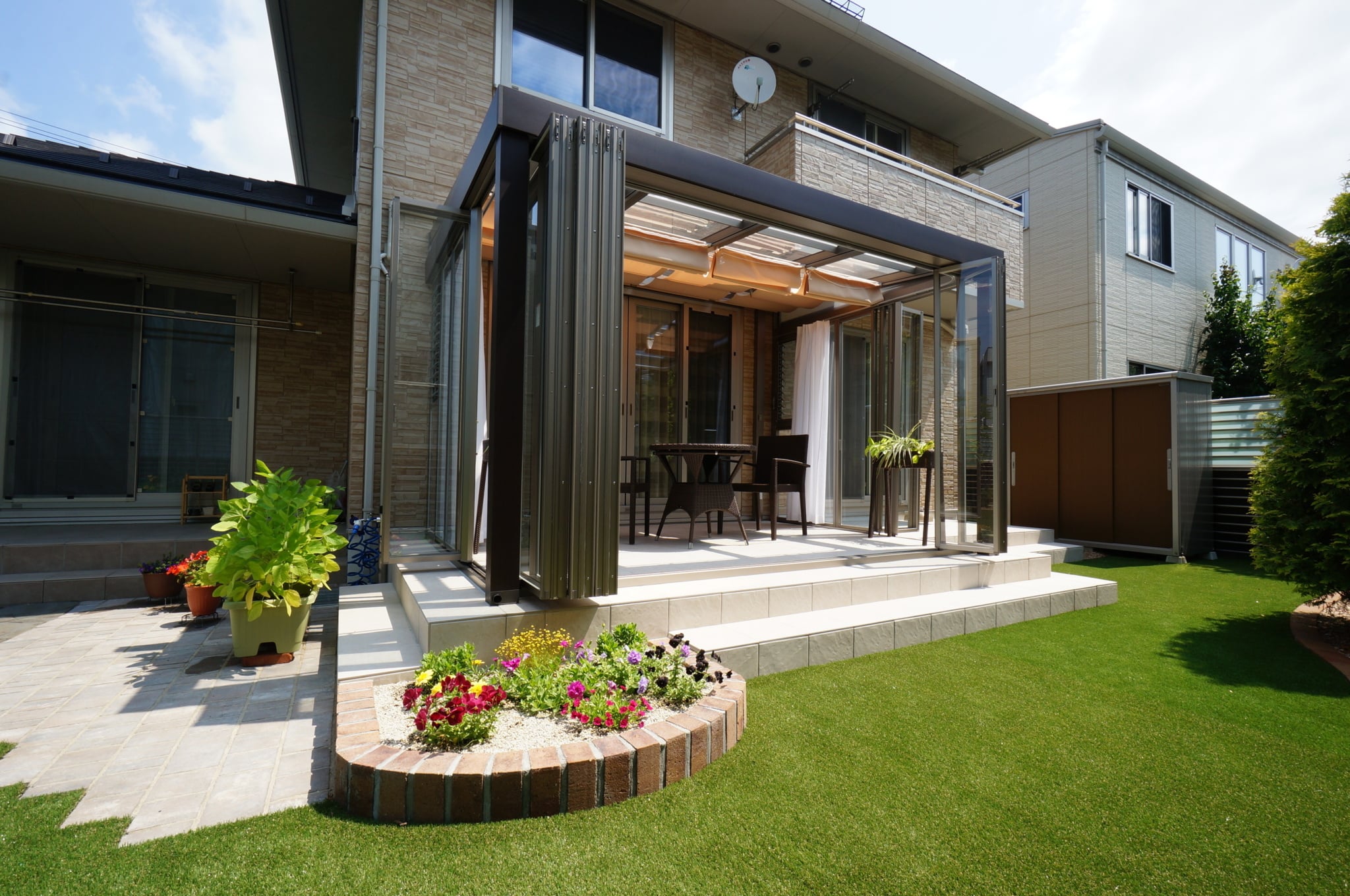 リフォーム・穏やかに楽しむガーデンライフ オアシスタイルテラスプライベート空間⼈⼯芝外構盛岡広々とした庭目隠しフェンス 所在地 盛岡市 穏やかな時間が流れるガーデン 晴天の日はシェード(日よけ)をひいて、曇りの日はたたんで日の光をたくさん取り入れてお洗濯を干したり、お茶の時間を楽しんだり、大活躍です。玄関前からのぞくデザインウール(飾り壁)は、お庭とエントラスをおしゃれに区切り、さりげなく目隠しの役割をしています。 DATA ガーデンルーム ジーマ (LIXIL) タイルテラス コンテⅡ (LIXIL) インターロッキング パエリア (エスビック) レンガ花壇 ロイヤルパインブリック (エスビック) その他施工実例 南国風リゾートガーデン 所在地 盛岡市 青と白のリゾートガーデン 所在地 盛岡市 リフォーム・緑鮮やかなグリーンガーデン 所在地 北上市