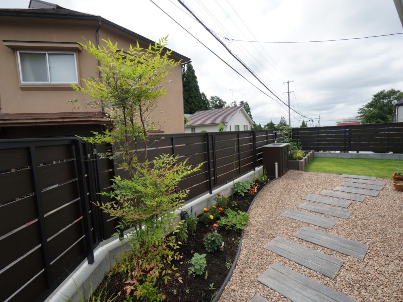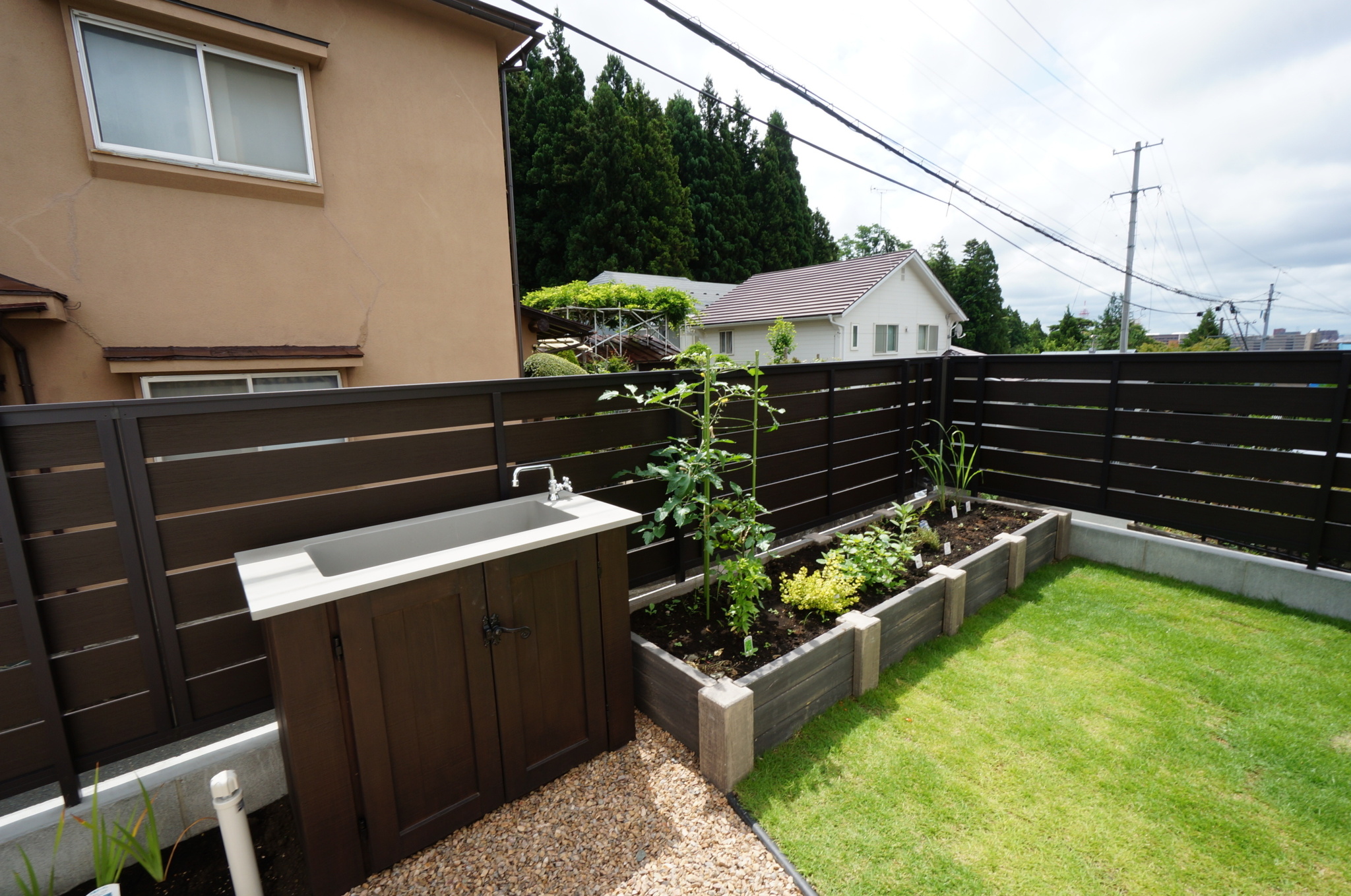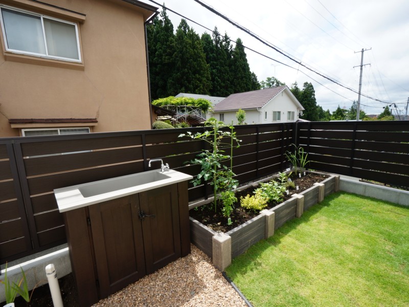 きれいな天然芝とかわいいキッチンガーデンができました。