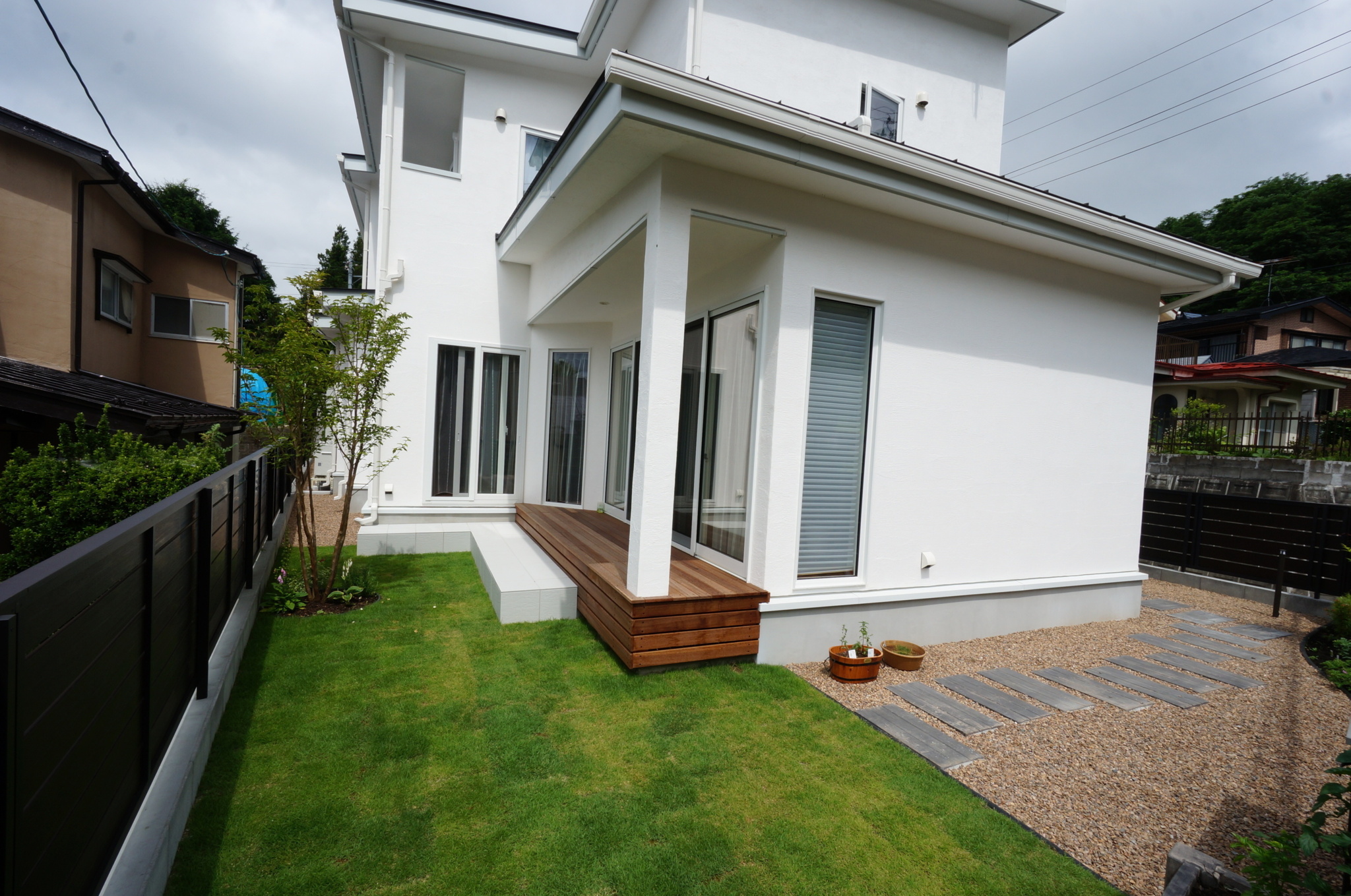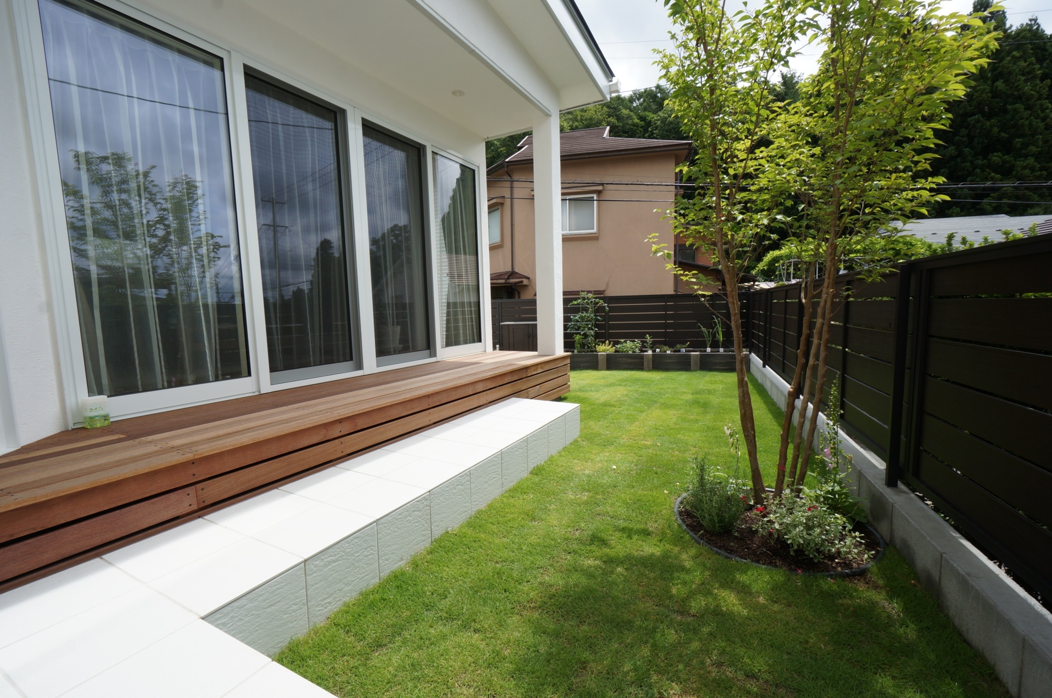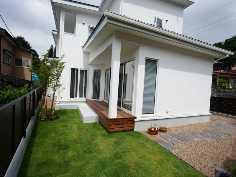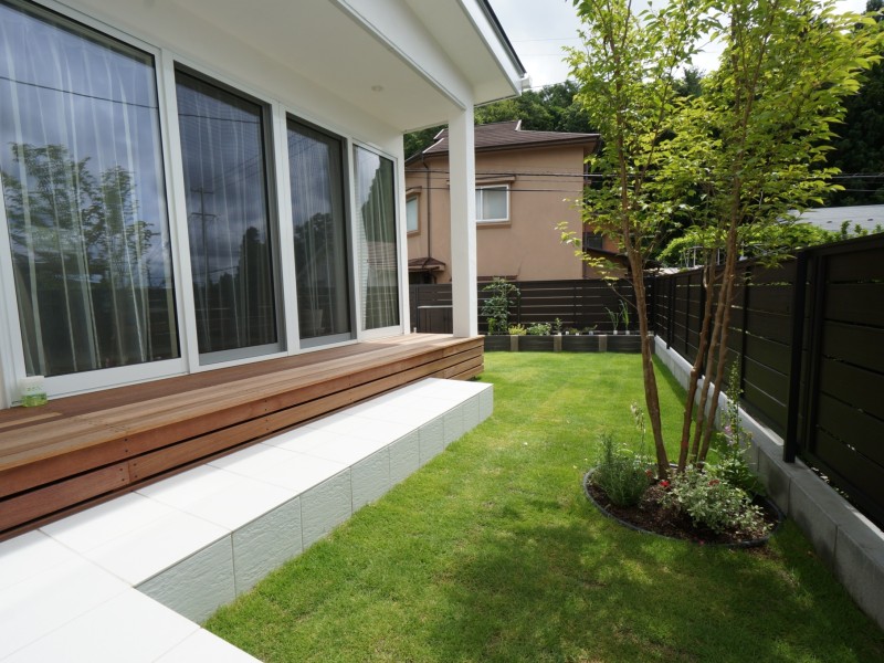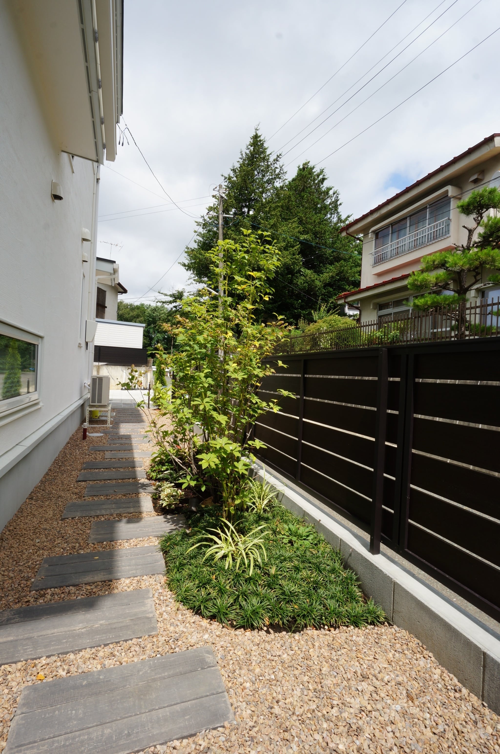 玄関から続く枕木風平板の園路と爽やかな木々の横を通っていくと緑豊かな天然芝のお庭が広がります。