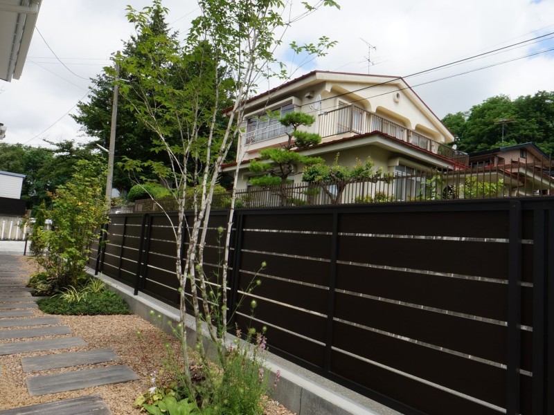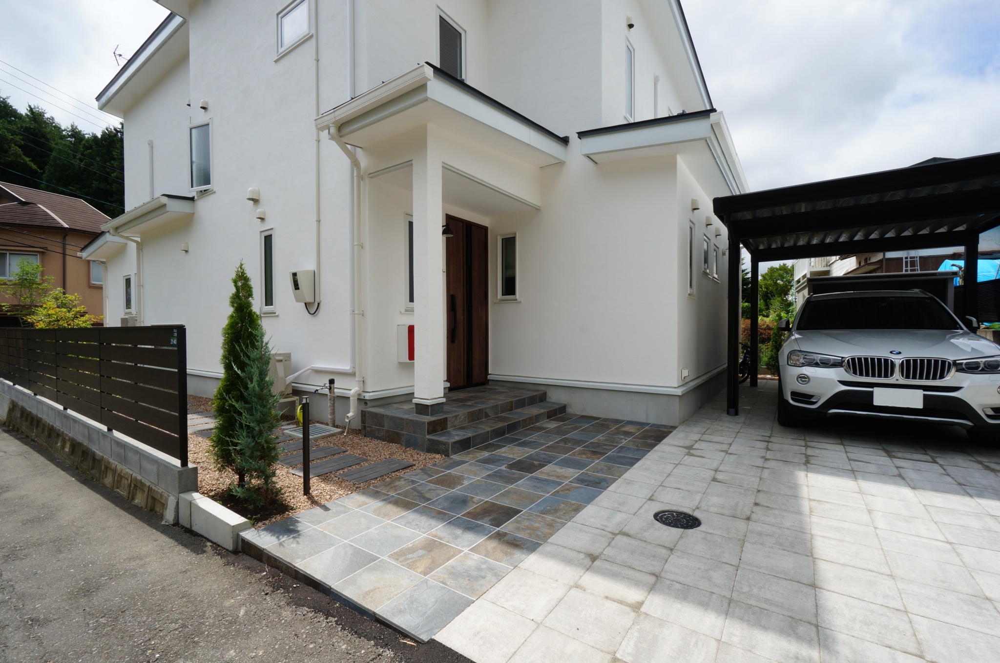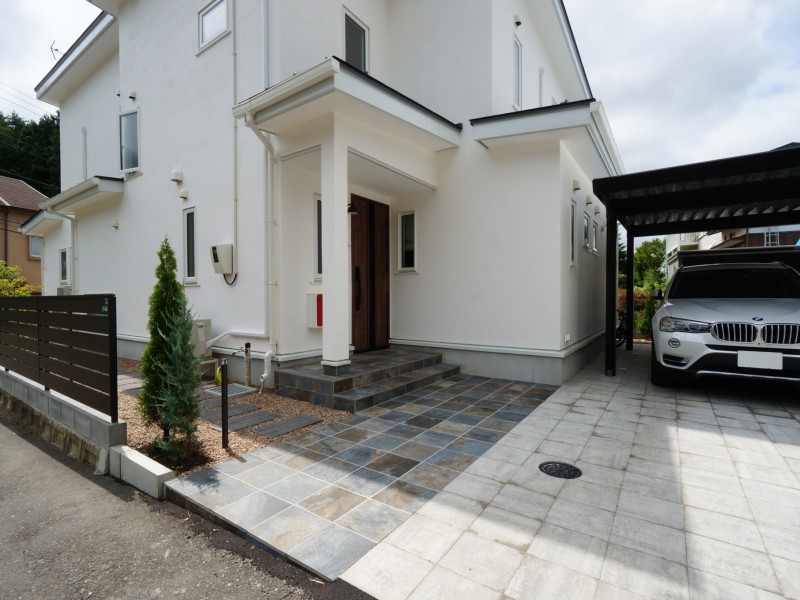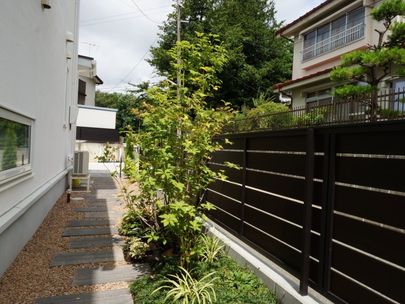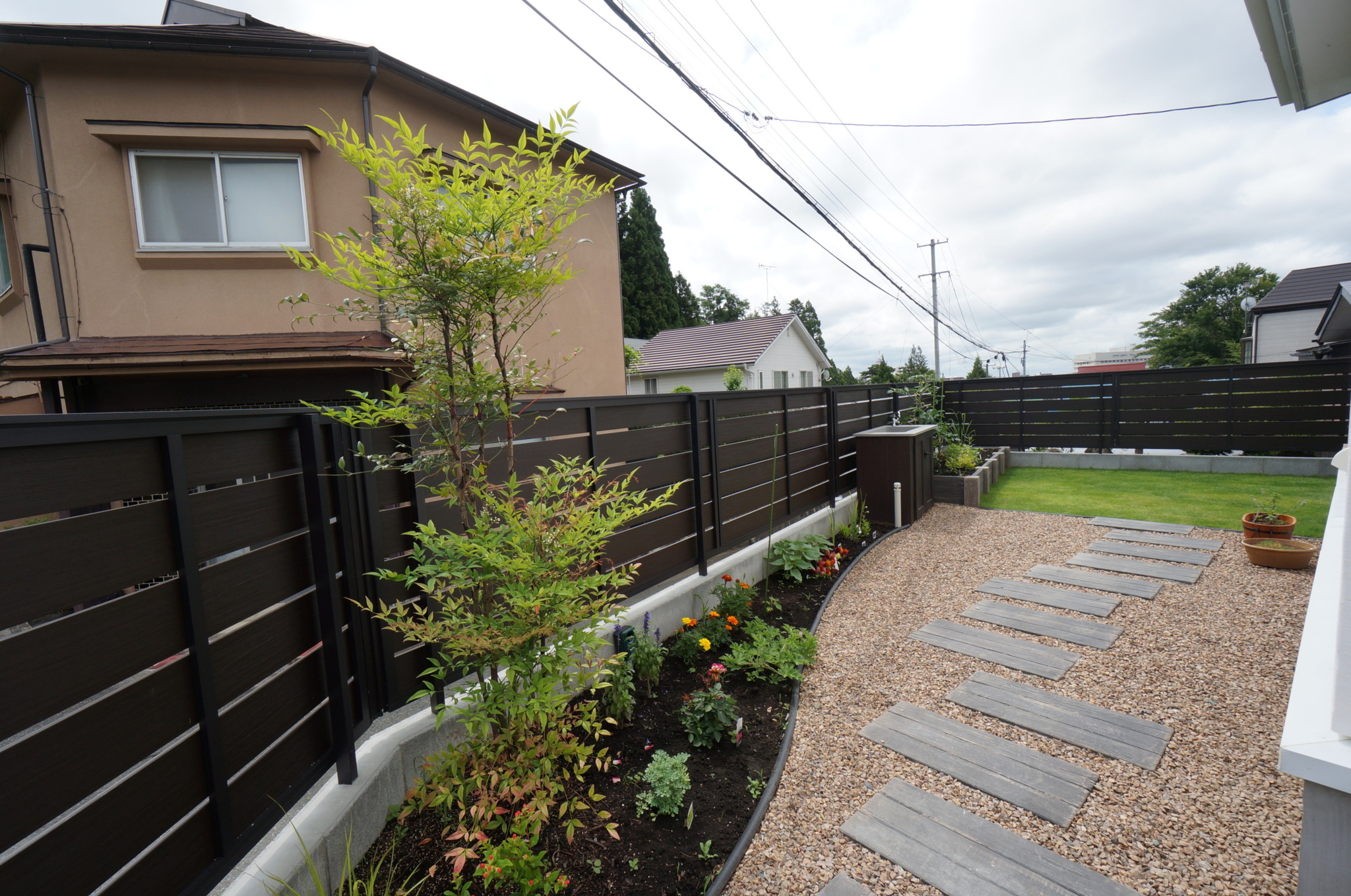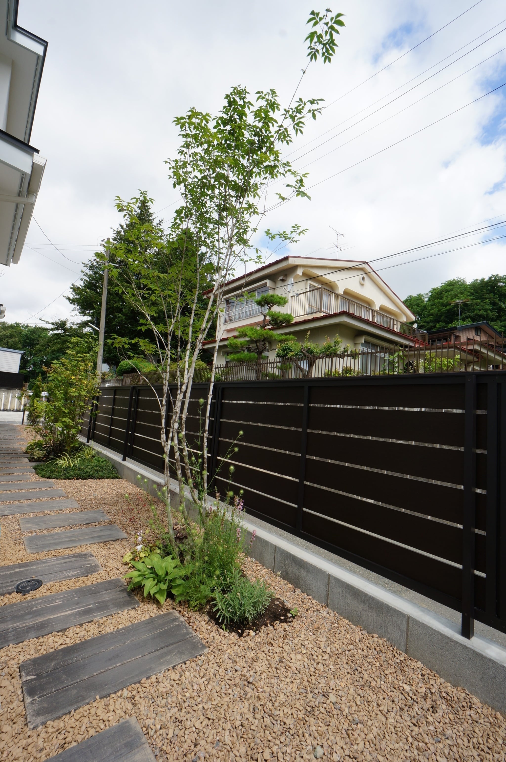玄関から続く枕木風平板の園路と爽やかな木々の横を通っていくと緑豊かな天然芝のお庭が広がります。