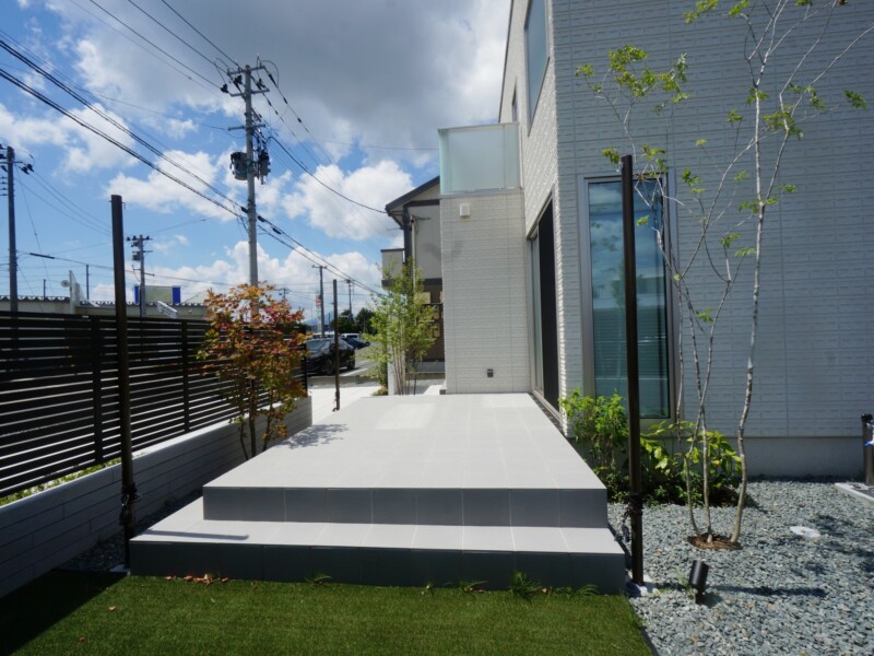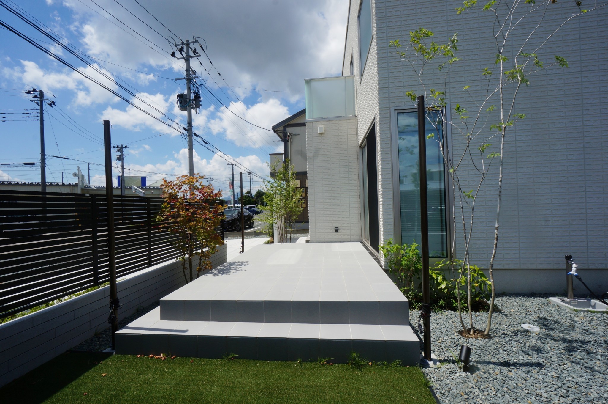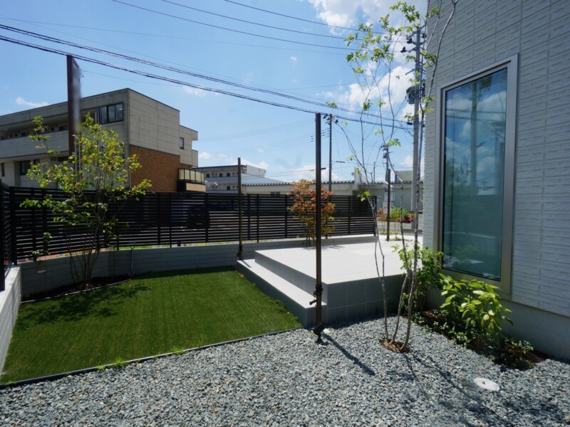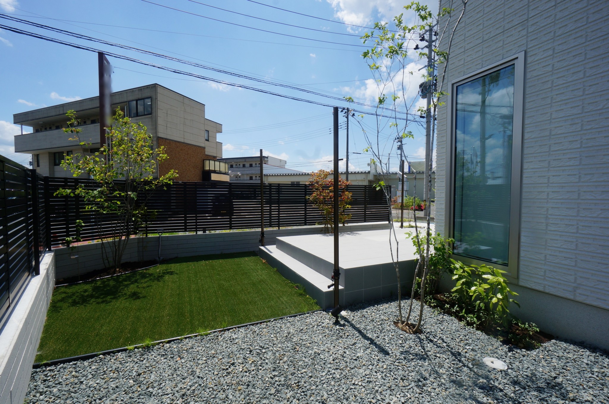 たくさんの木々がお庭を囲んで緑溢れる空間となっています。フェンスで程よくプライベート空間を仕切りでも圧迫感のない開放的な雰囲気になっています。タイルテラスはリビングから段差なく出入りでき快適です。木々がどんどん生長してもっと緑豊かな空間となるでしょう。