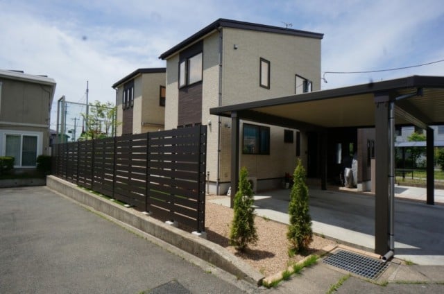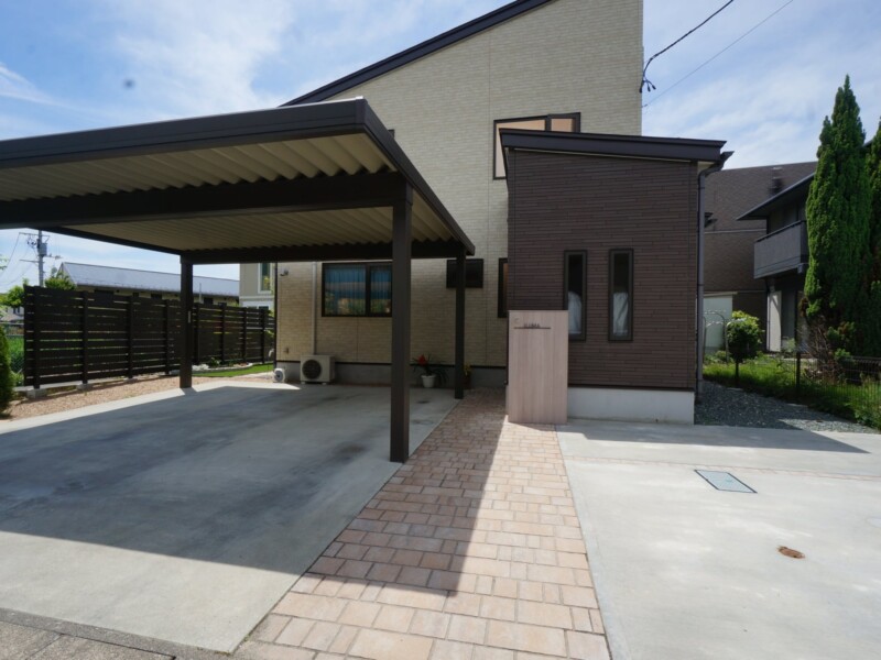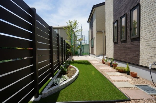 目隠しフェンスを設け人工芝とインターロッキング敷きでコートを作りました。さらにタイルのテラスとオーニングを設けプライベートガーデンの出来上がりです。インターロッキングと人工芝なので防草効果もあり手入れも楽になりました。また、玄関前は門袖を新しく設け引き締まった印象になりました。