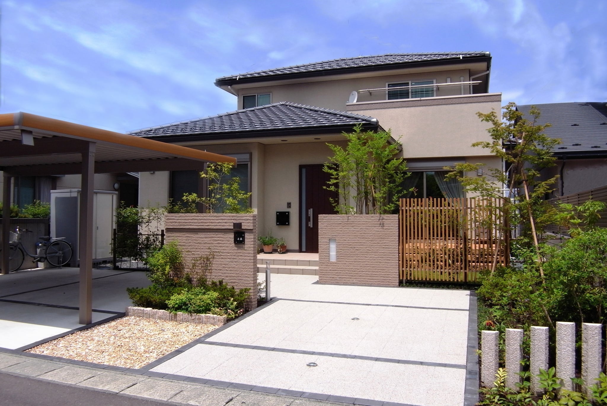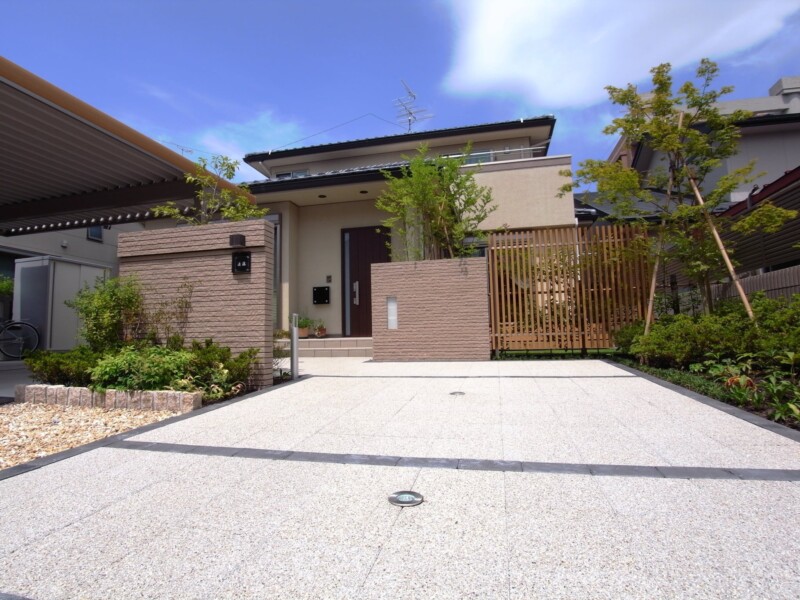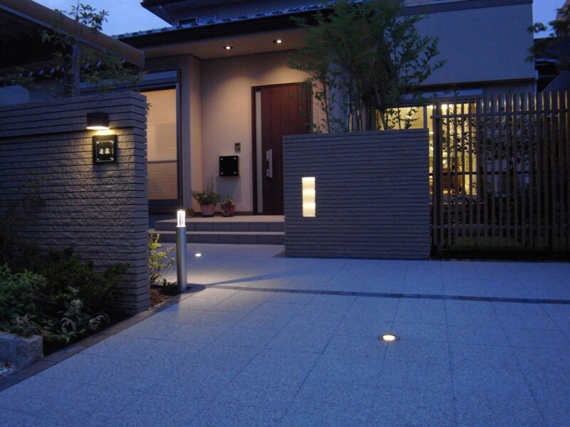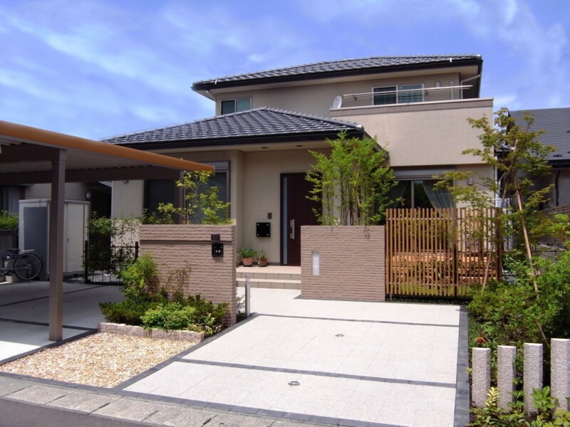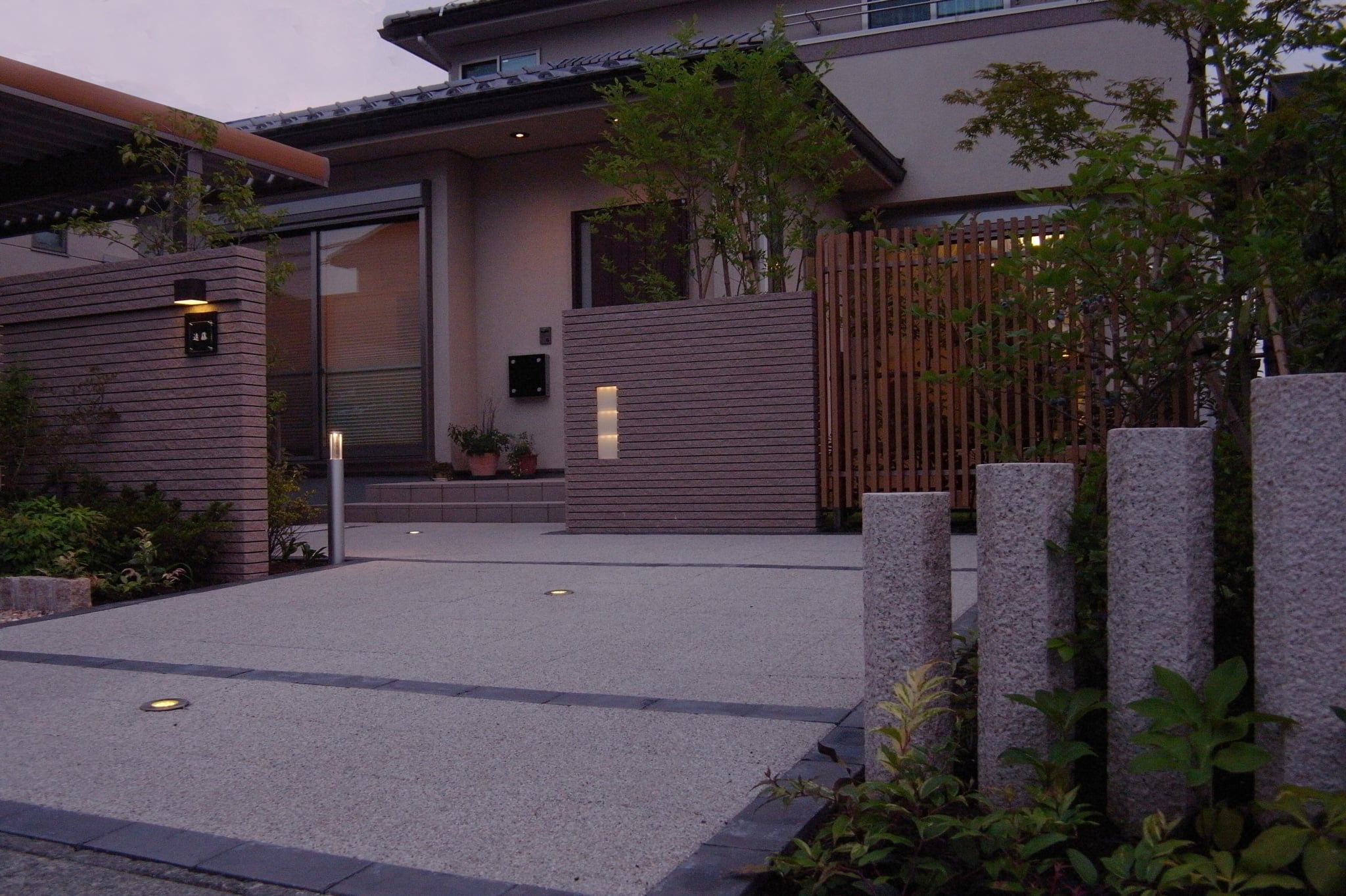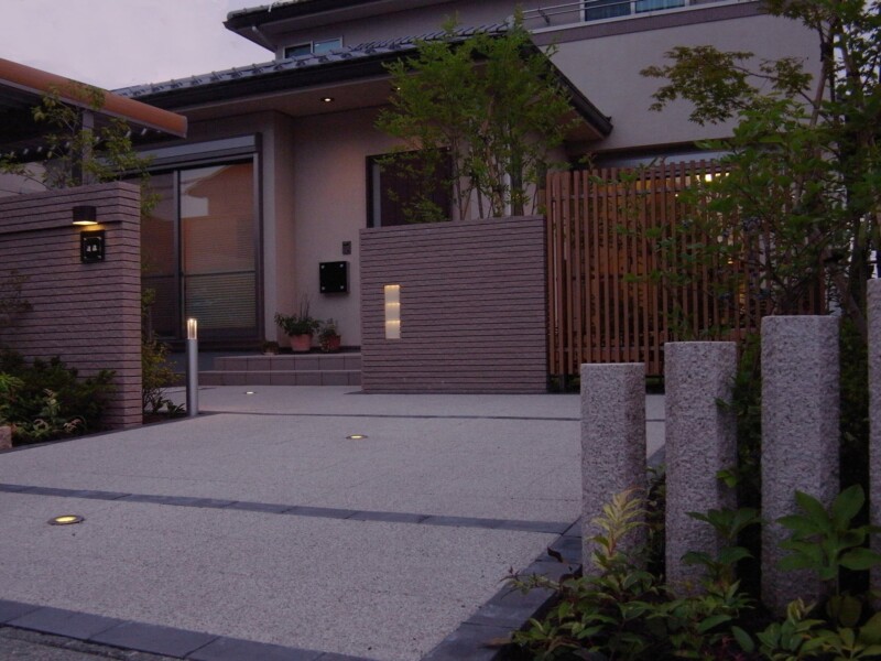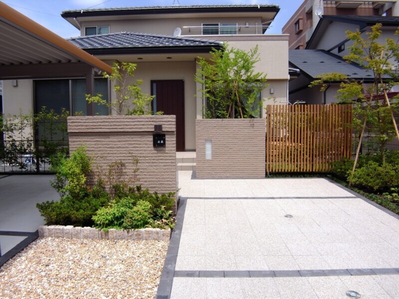 道路側の石柱、少し奥まってタイル貼りの門袖、さらに玄関前門袖と3段階に変化をつけ、玄関までの奥行感