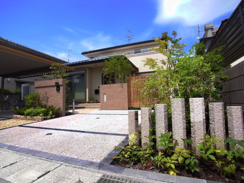が出ています。重厚でありながら閉鎖的ではない丁度いい雰囲気を出しつつ道路からの視線はちゃんと遮るように工夫しました。建物に調和するように、素材もこだわり、落ちついていて心地よい、訪れる人をやさしく迎え入れてくれる門まわりになりました。