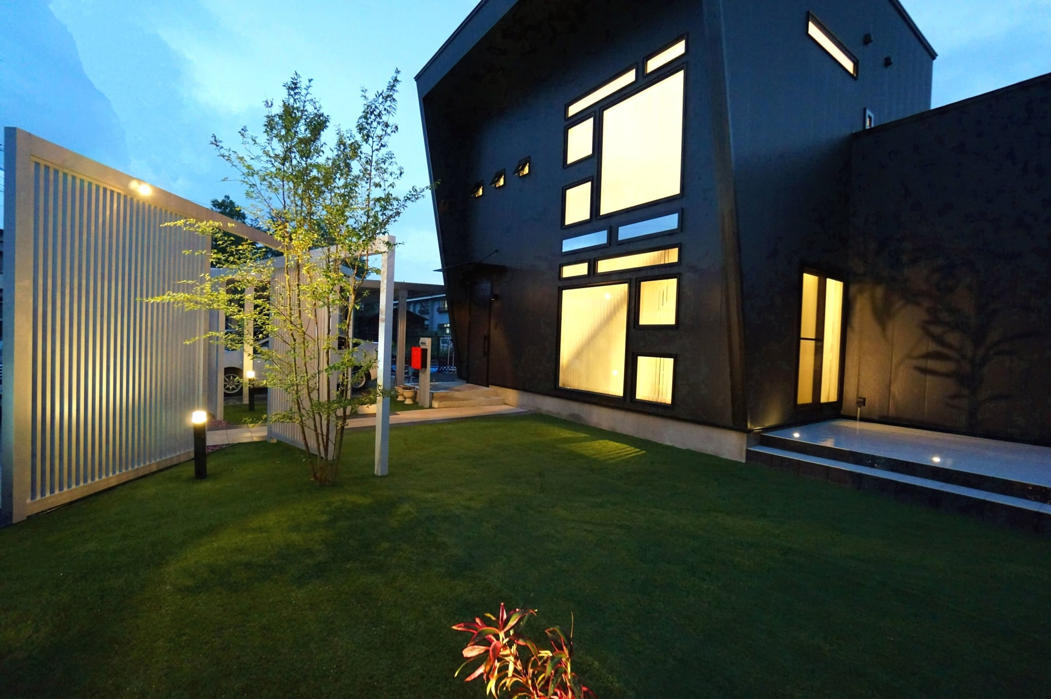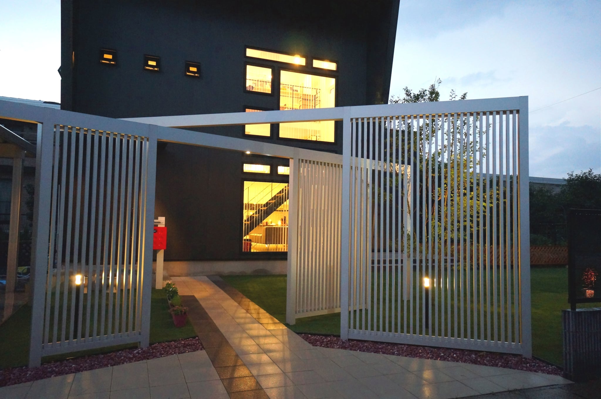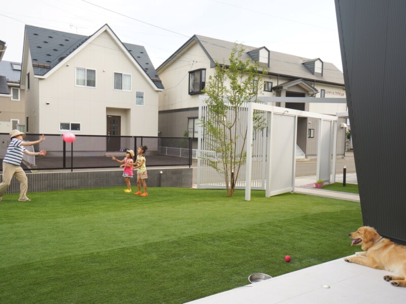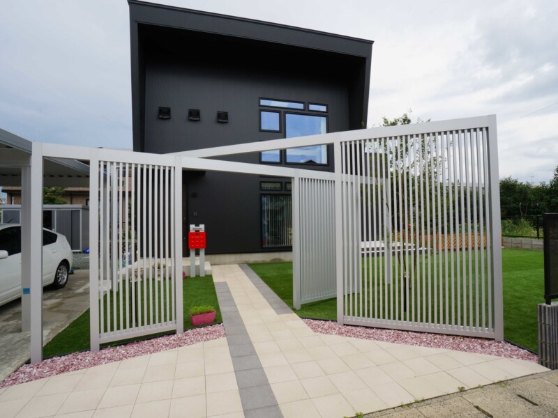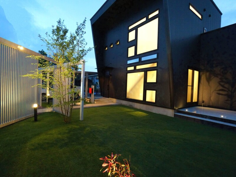 迫力のある縦格子のスクリーンを使ったエントランスで、より印象的で個性的な外観になりました。スクリーンは、見る角度よって家の中が見えにくくなるので、圧迫感なく程よい目隠しに効果があります。広い人工芝のお庭は圧巻で、お子様がワンちゃんと一緒に遊び走り回れます。メンテナスもラクなので、広い敷地でも草取りなど苦労することもありません。夜はライトアップされて、幻想的な雰囲気になります。