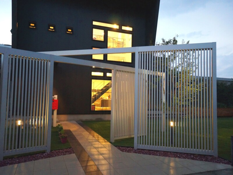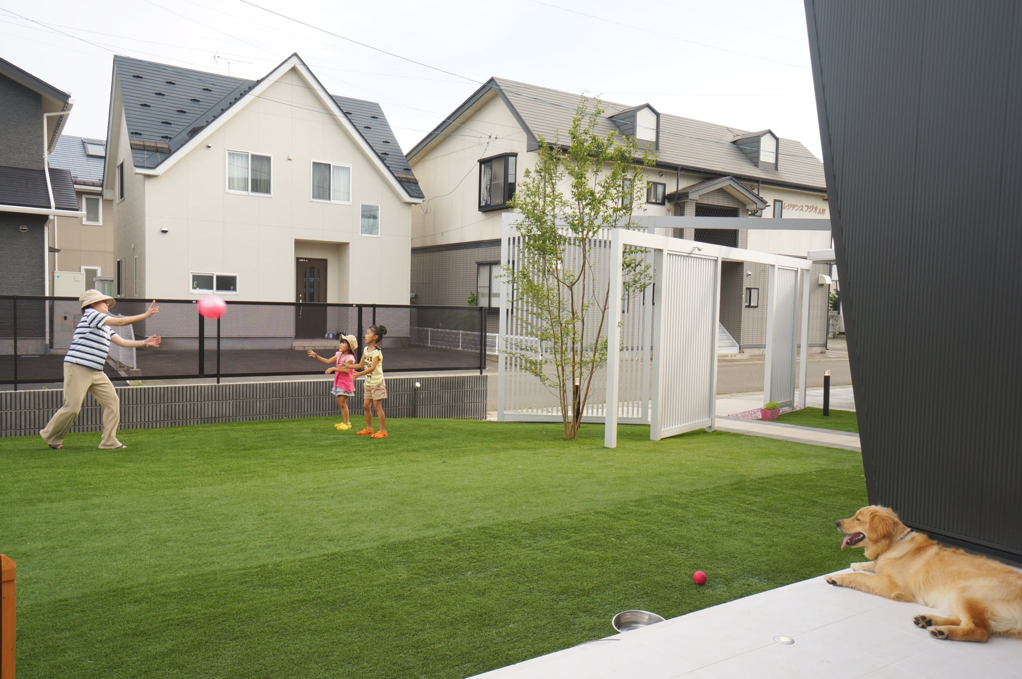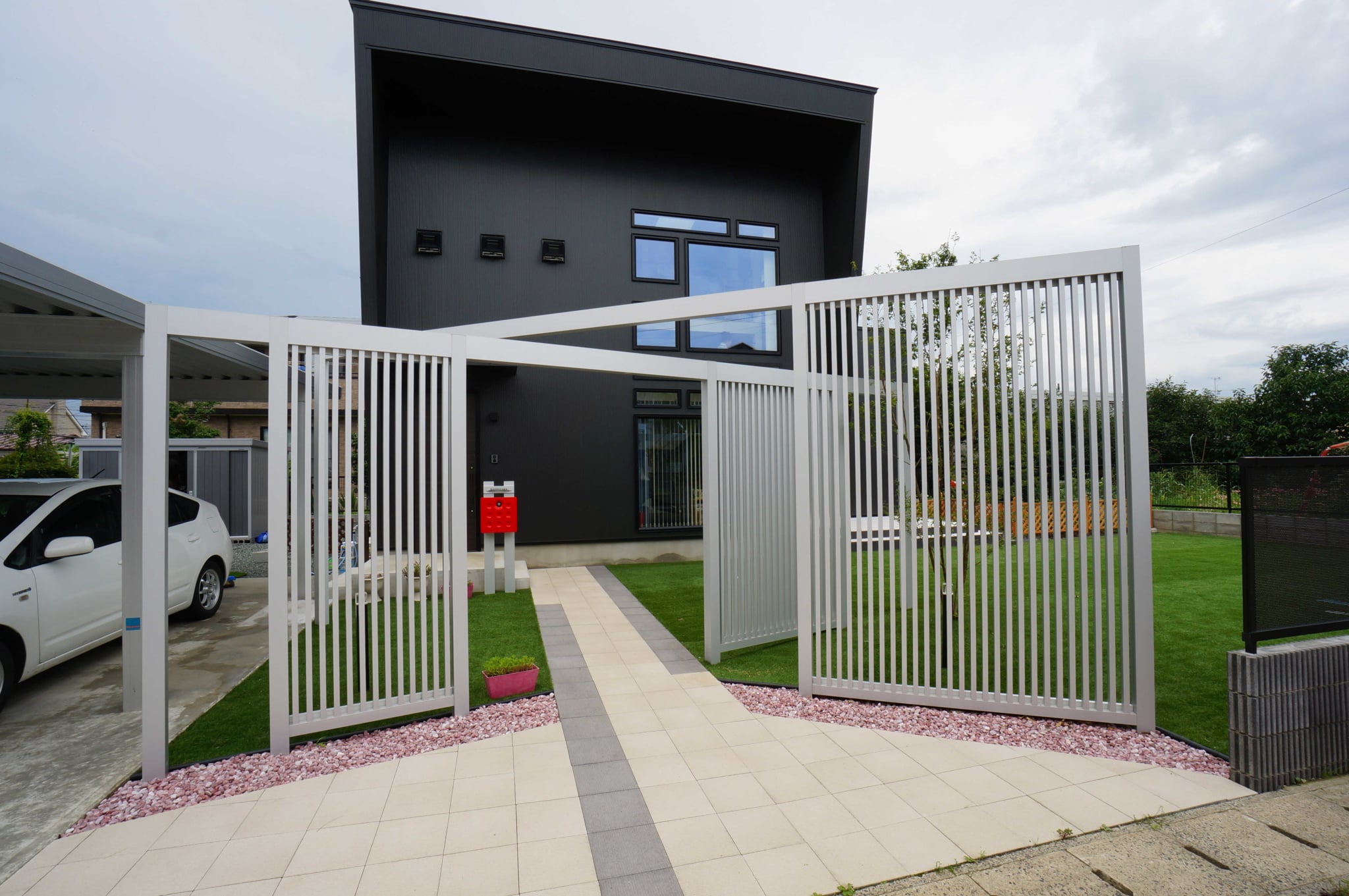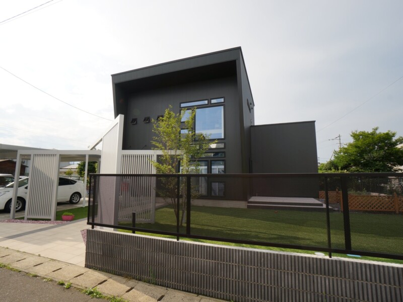 迫力のある縦格子のスクリーンを使ったエントランスで、より印象的で個性的な外観になりました。スクリーンは、見る角度よって家の中が見えにくくなるので、圧迫感なく程よい目隠しに効果があります。広い人工芝のお庭は圧巻で、お子様がワンちゃんと一緒に遊び走り回れます。メンテナスもラクなので、広い敷地でも草取りなど苦労することもありません。夜はライトアップされて、幻想的な雰囲気になります。