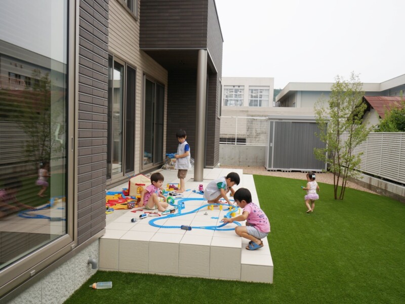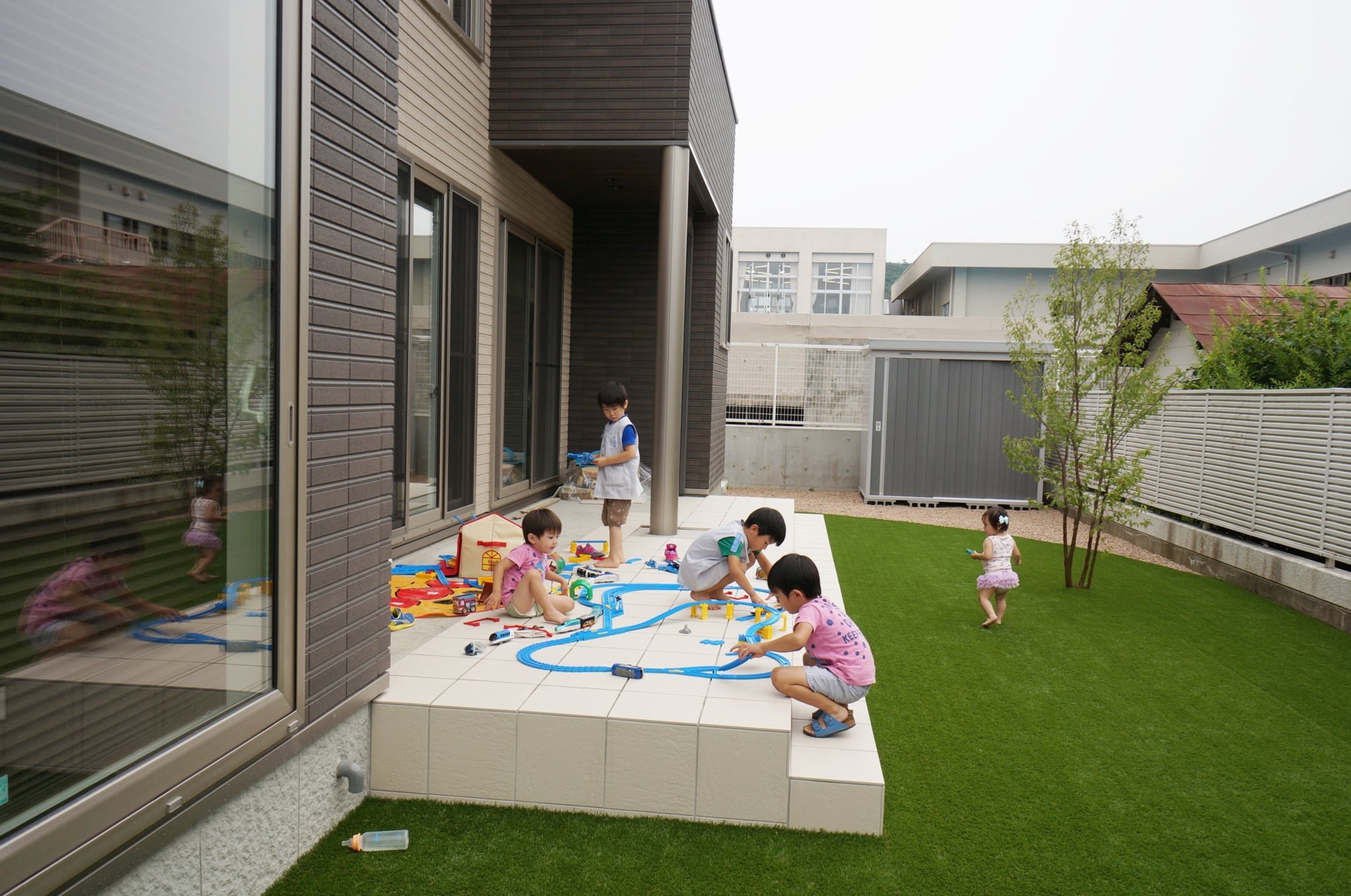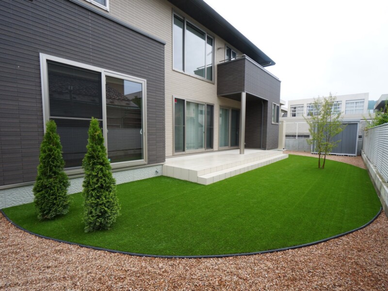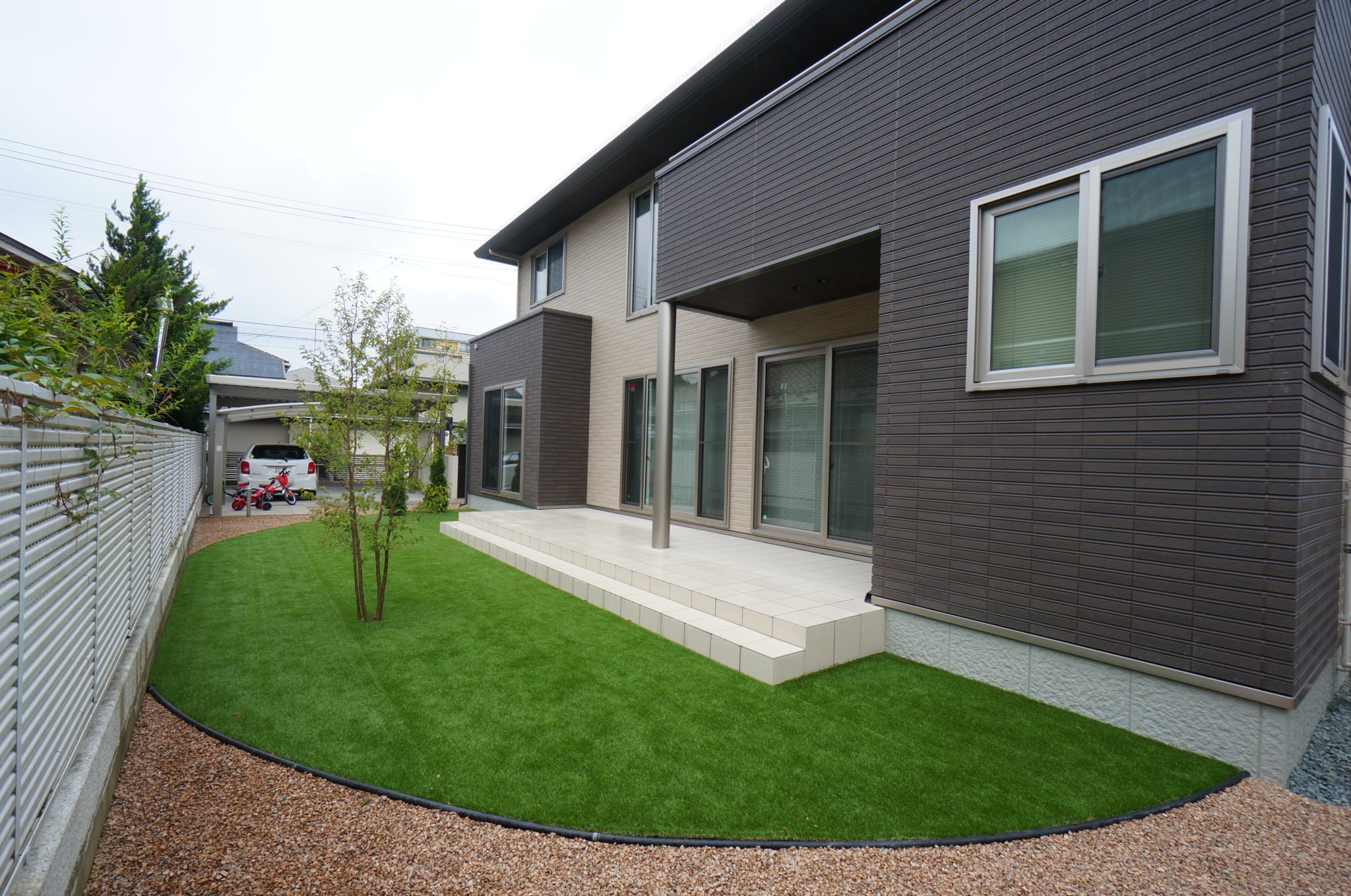 かわいい形の人工芝と広いタイルテラスでみんな楽しく遊べるお庭です。