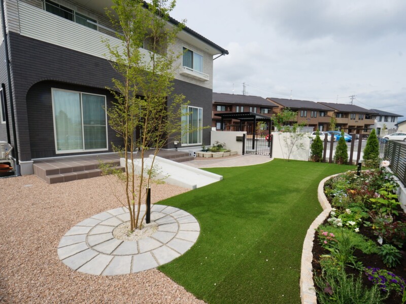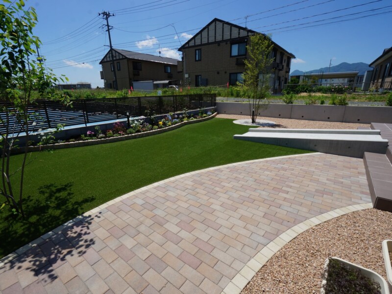 広いお庭を人工芝を敷いて管理が楽になるように、歩き心地も良く、フカフカの人工芝の感触は気持ちが安らぎます。玄関からリビング前までつなげた広いタイルテラスやスロープでいつでも気軽にお庭に出ることができます。
