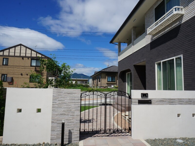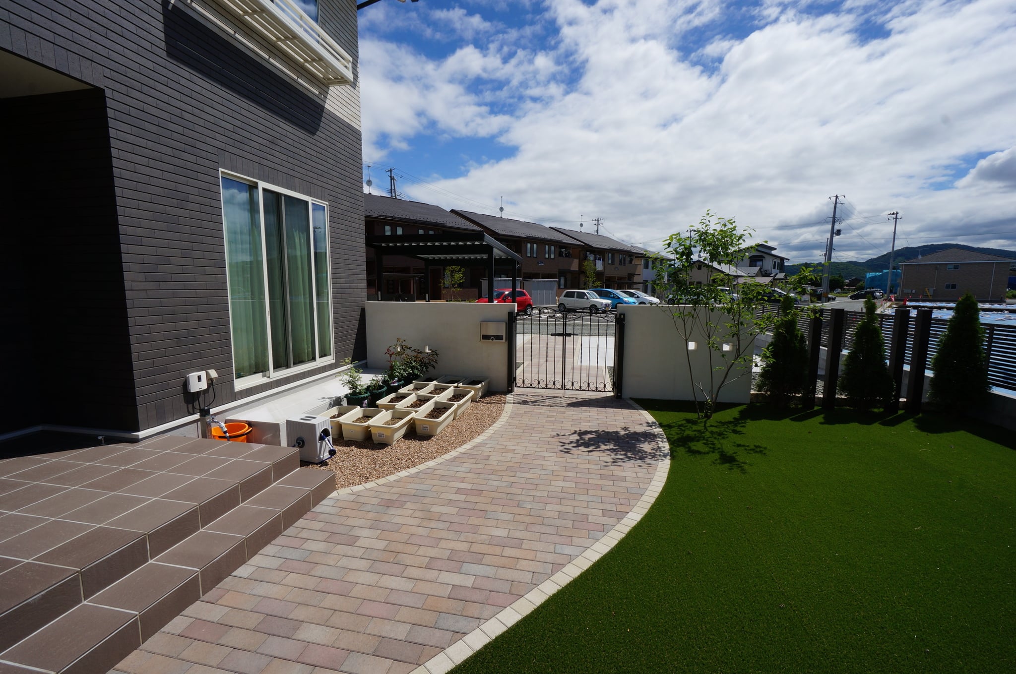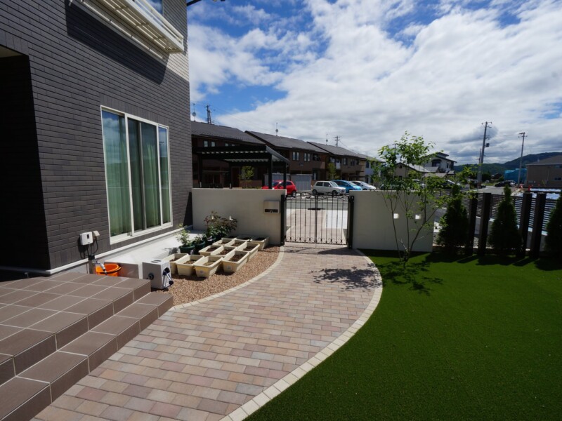 アプローチは微妙な色合いが素敵な平板とインターロッキングで門の外は直線でモダンな印象に、庭を通って玄関までは曲線で優しい印象です。アイアンの門扉やタイル、建物の雰囲気に合わせた色合いで上品で優しい印象のエクステリアとガーデンに仕上がったと思います。
