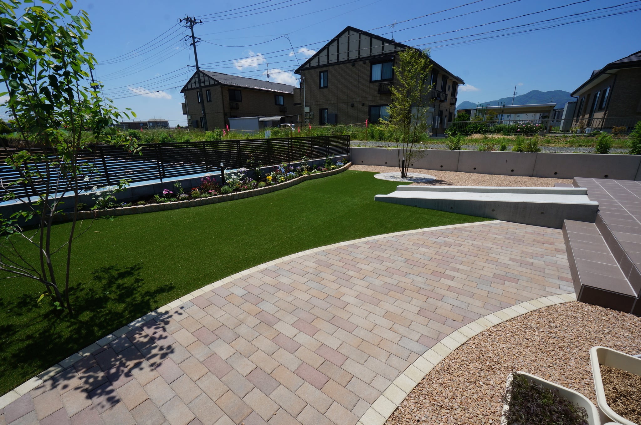 お庭の中央にはサークルテラスとシンボルツリーのヒメシャラが爽やかです。