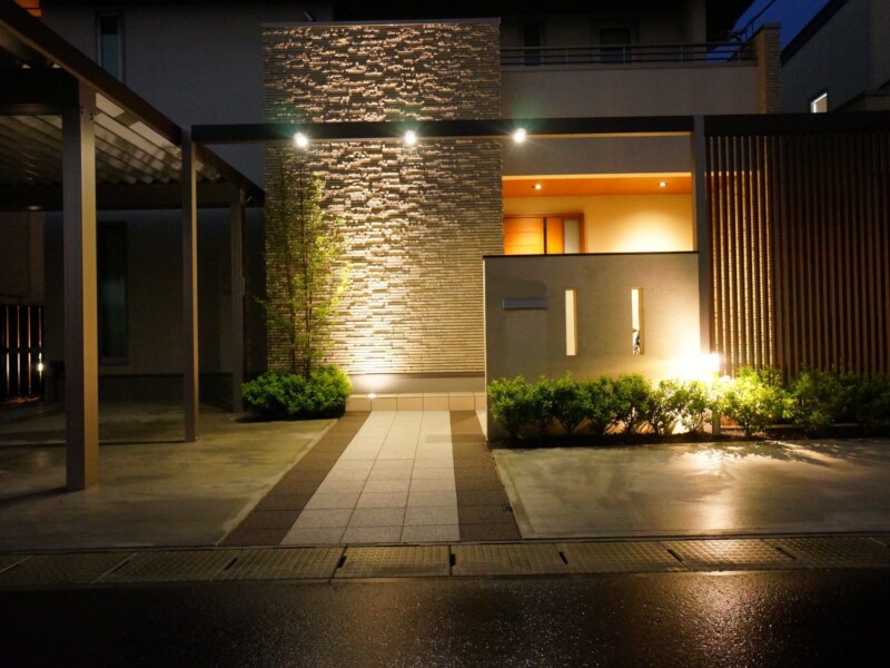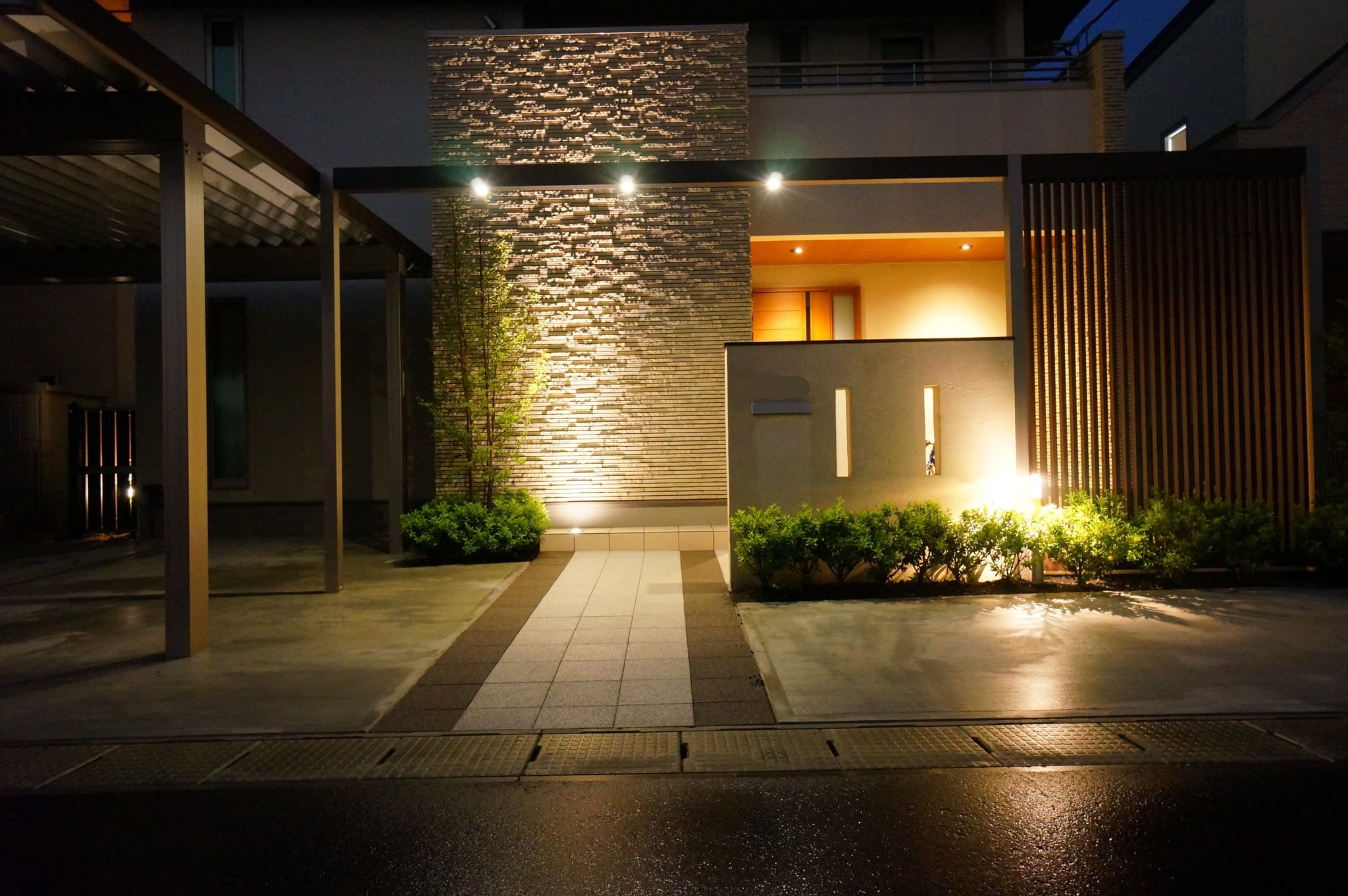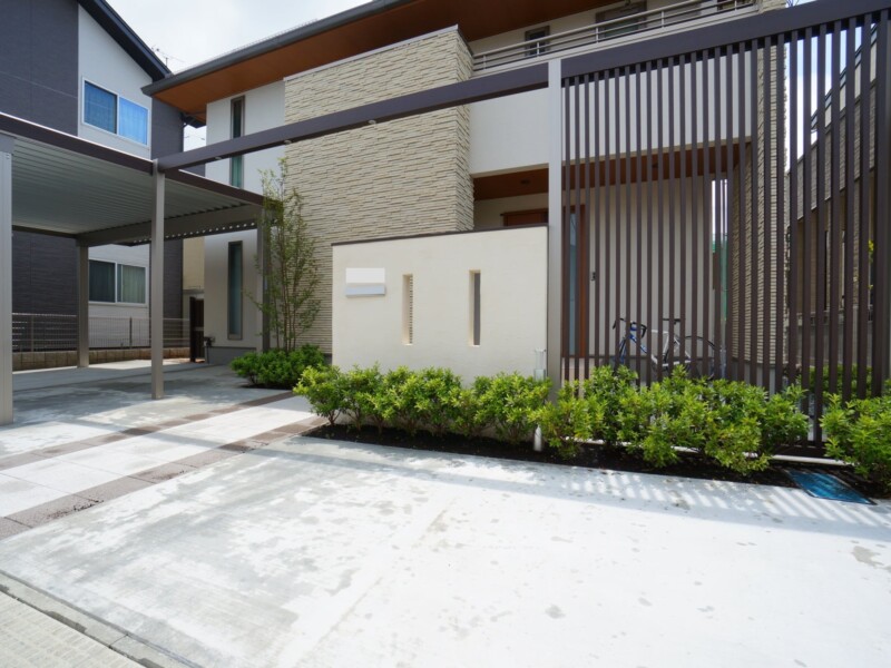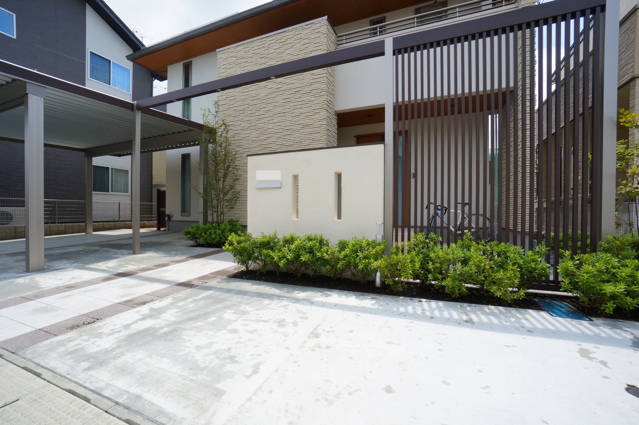 エントランスの配置やカーポートとファサードの高さのバランスにこだわりました。リビングまえの