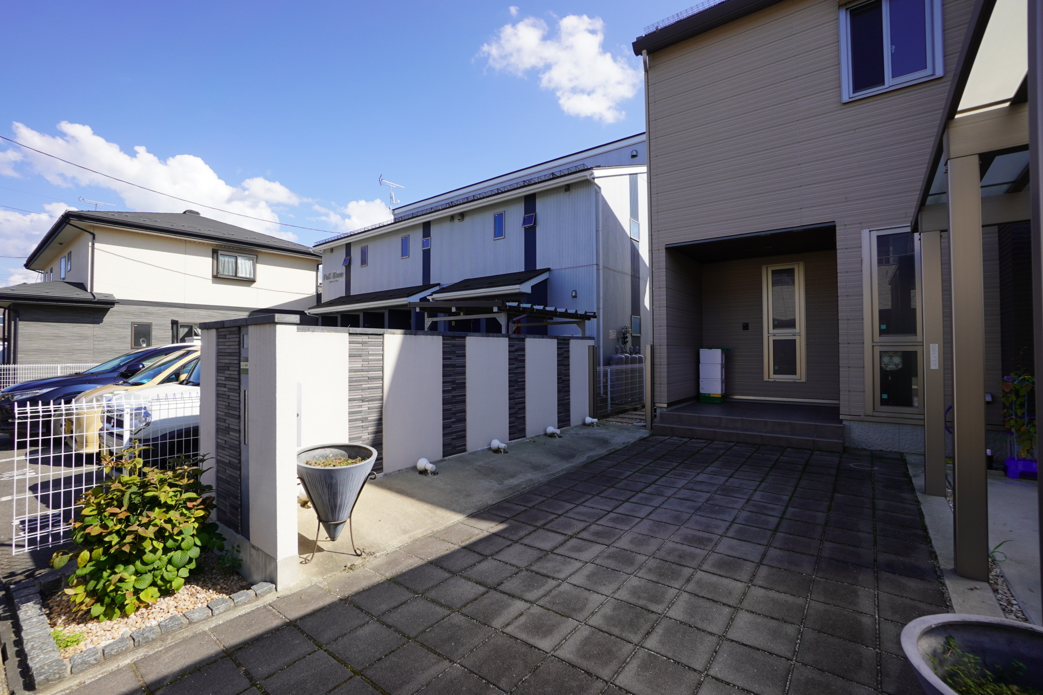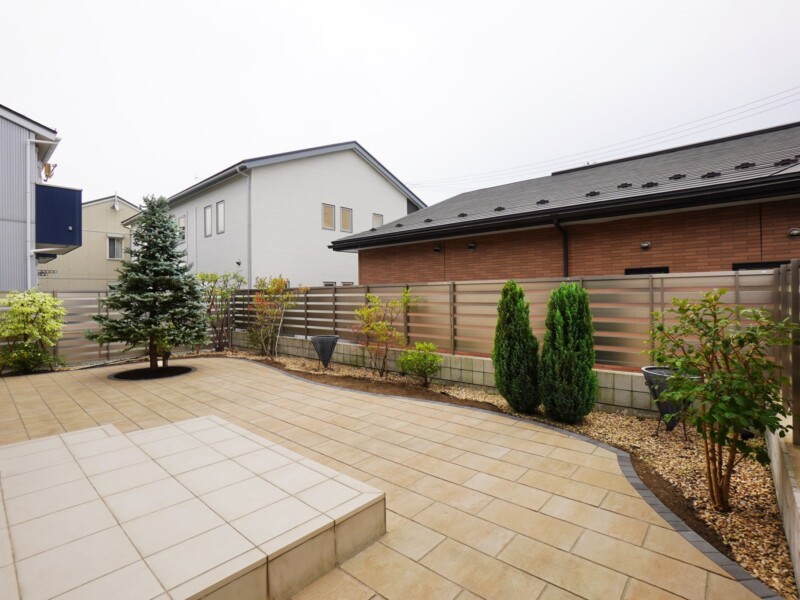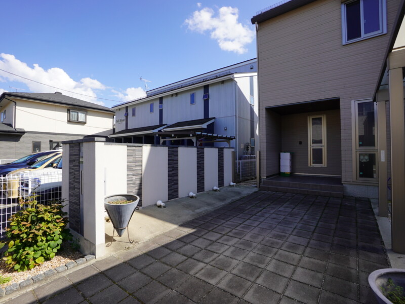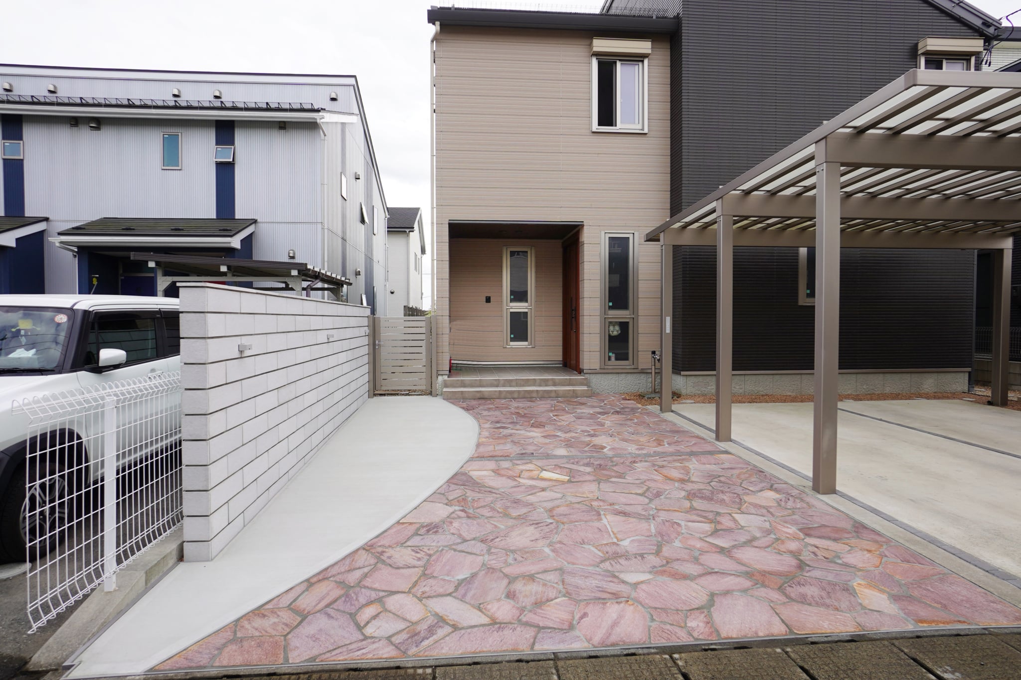 経年で暗い印象になっていたアプローチを明るい自然石の乱貼りにリフォームし、隣地沿いの塀も明るい