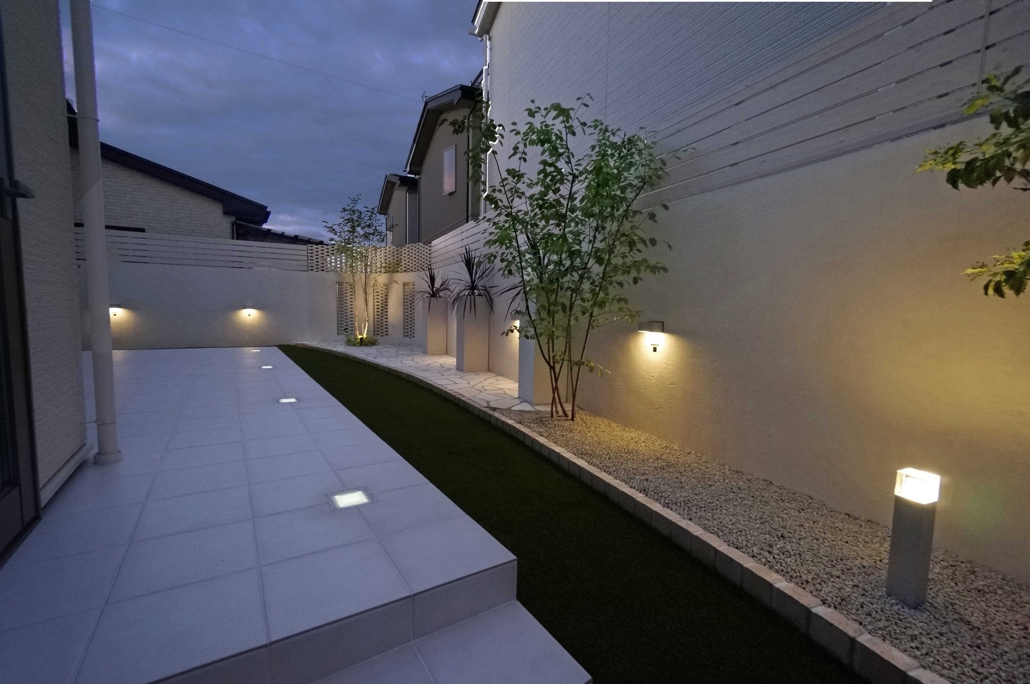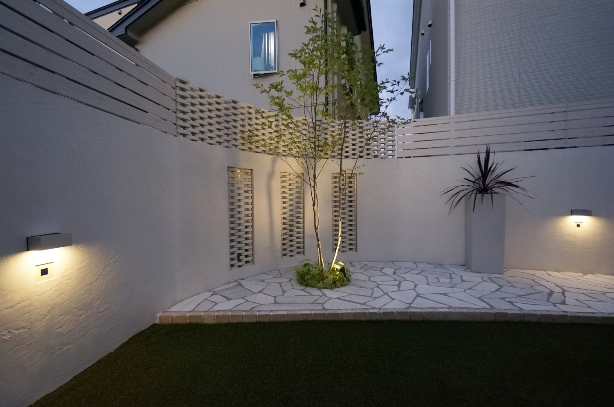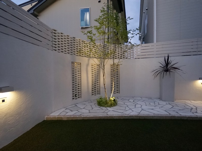 目隠しを兼ねたデザインウォールは白い木目調フェンスと組み合わせることで軽やかな印象に。LEDライトで照らしたスクリーンブロックは印象的な影をもつくり、テラスに埋め込んだタイルドライトはテラスをほんのりと照らし、夜は幻想的な雰囲気です。