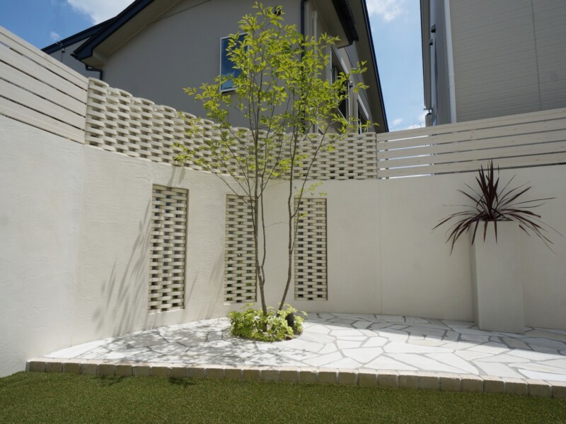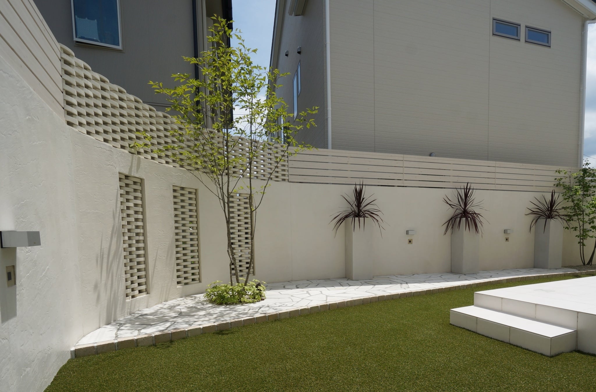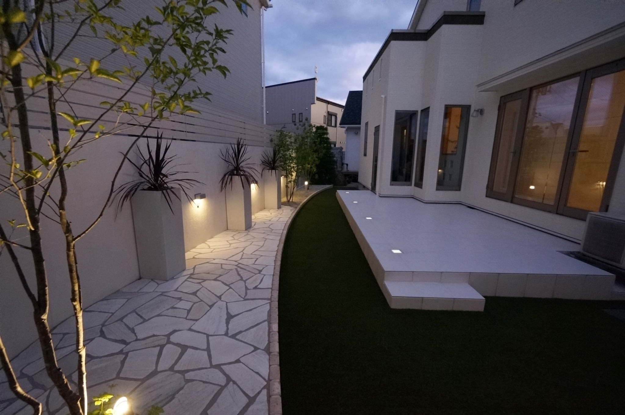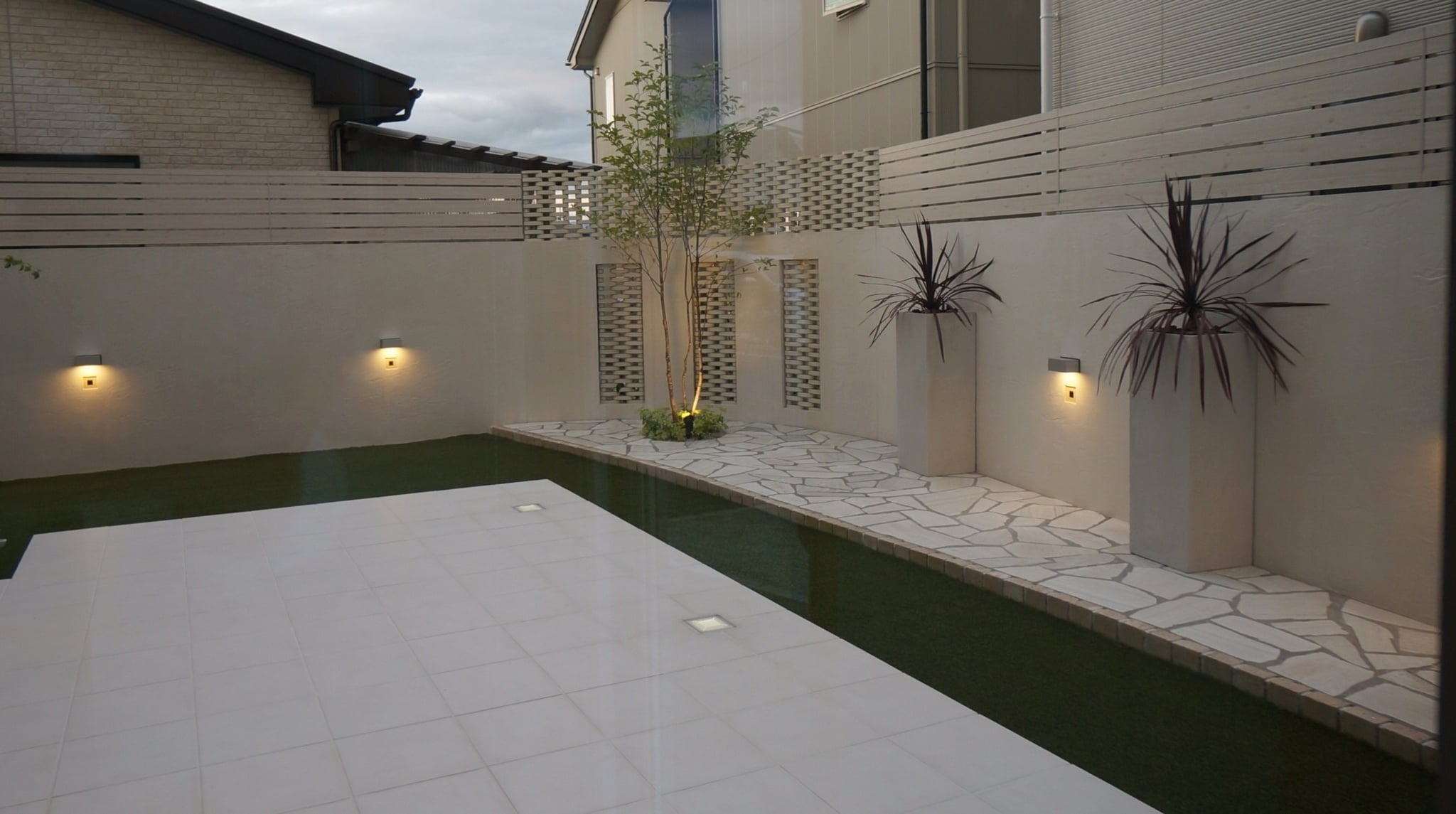 目隠しを兼ねたデザインウォールは白い木目調フェンスと組み合わせることで軽やかな印象に。LEDライトで照らしたスクリーンブロックは印象的な影をもつくり、テラスに埋め込んだタイルドライトはテラスをほんのりと照らし、夜は幻想的な雰囲気です。