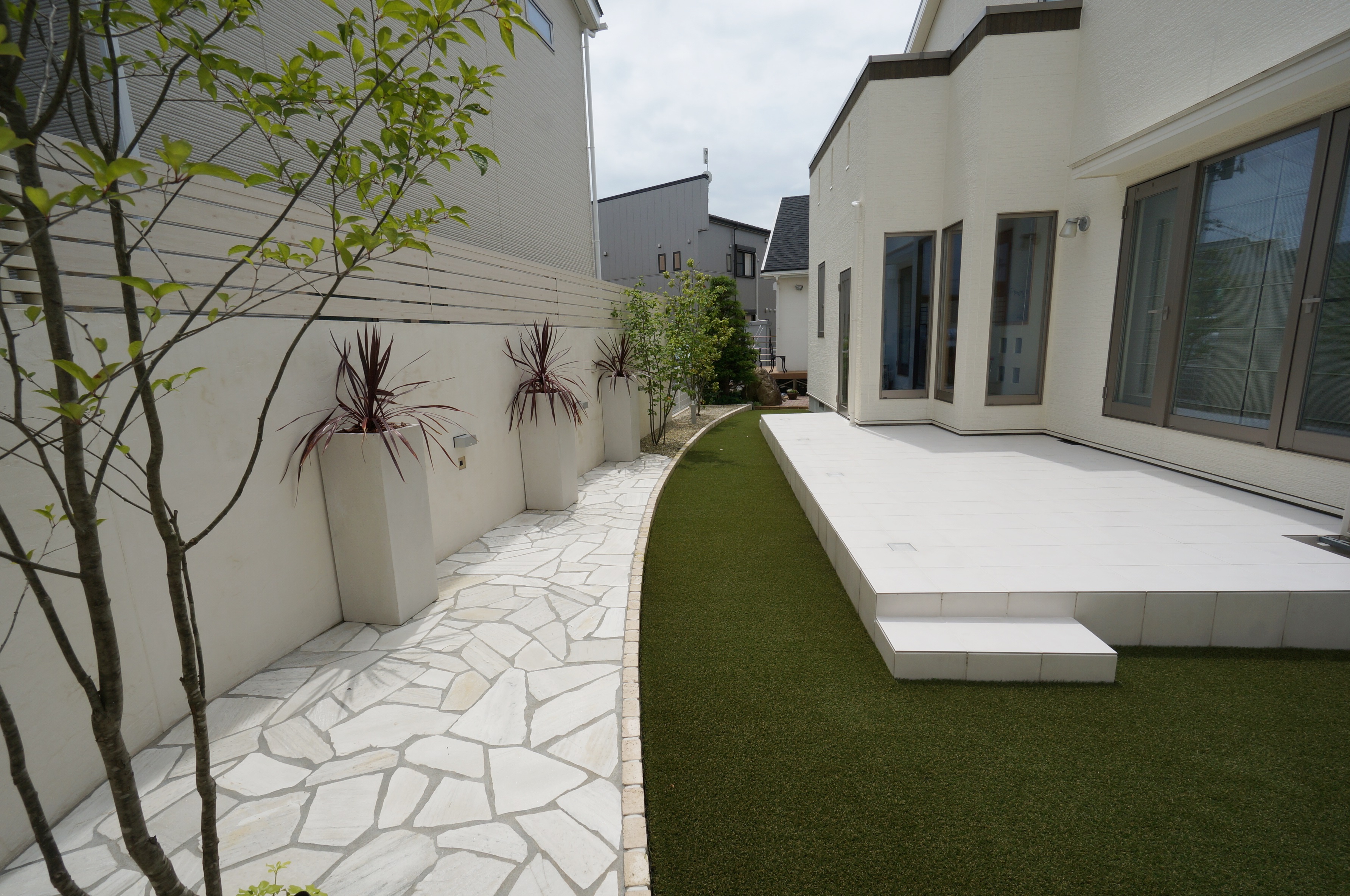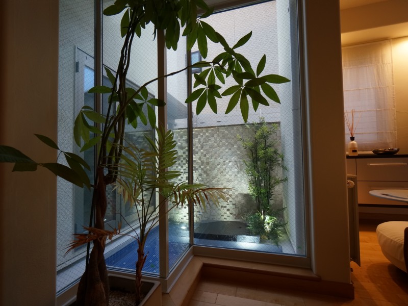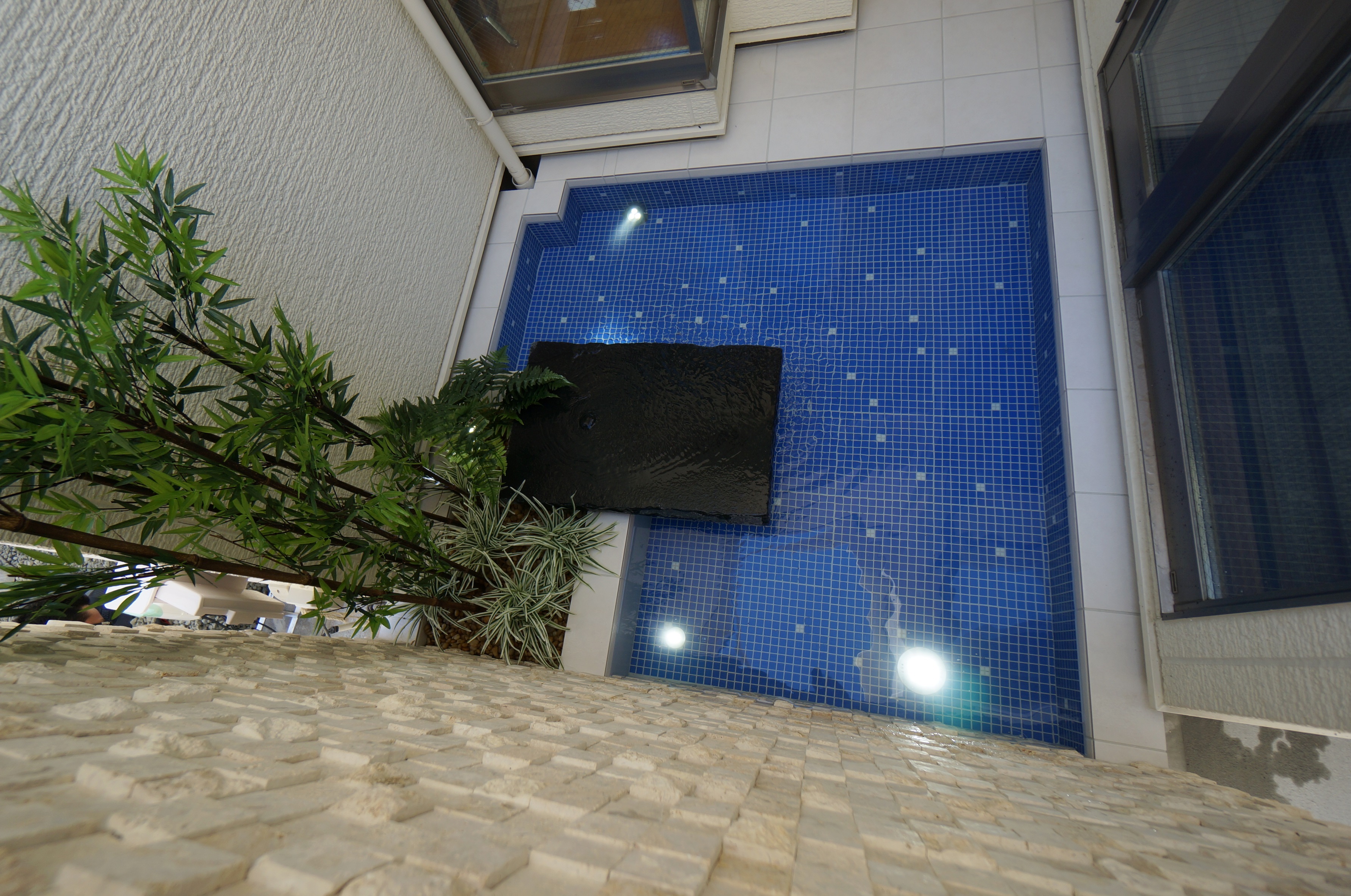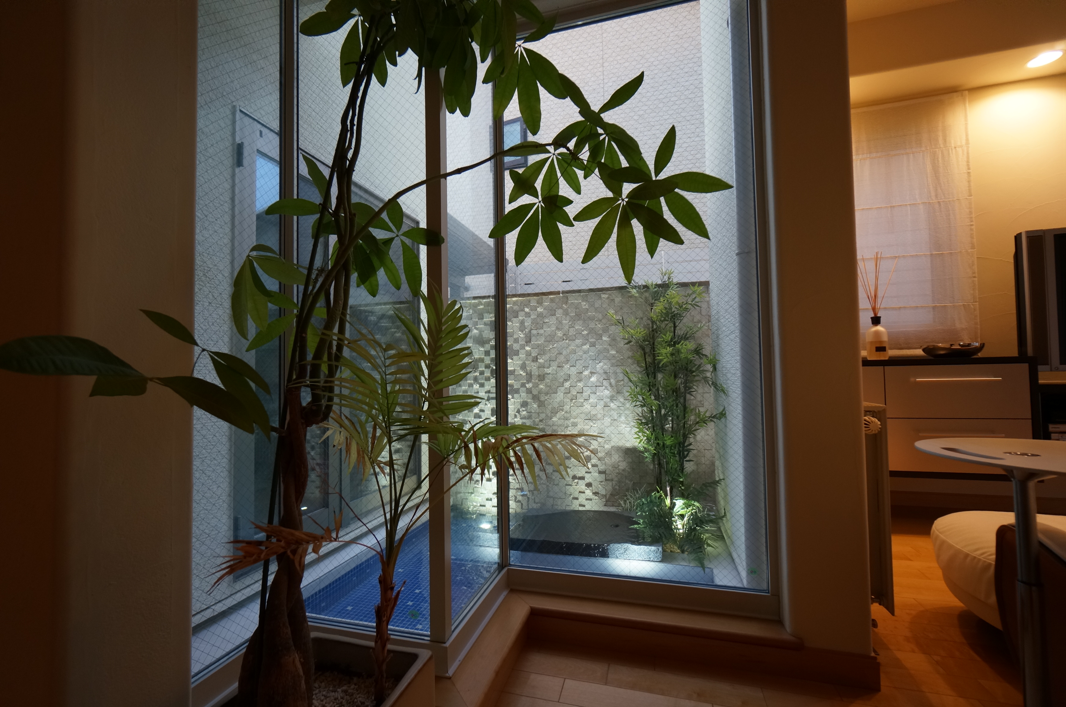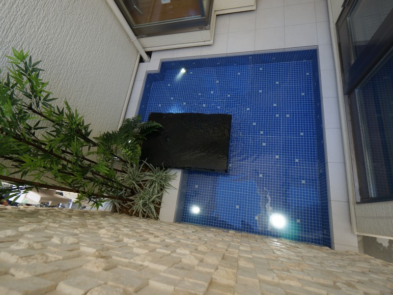 白の空間に木々の緑と人工芝の緑が映え、さわやかなプライベートガーデンになりました。中庭のウォーターガーデンは、サンゴ風貼り材と海を思わせるあざやかな青いタイルで、まさにリゾート風です。