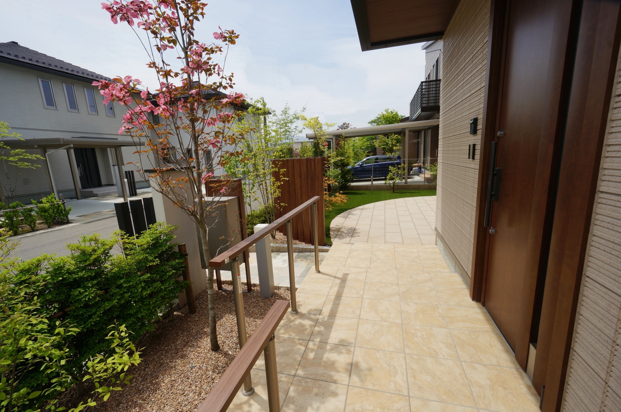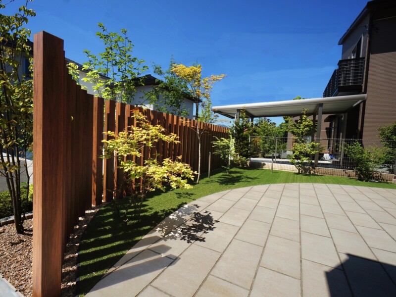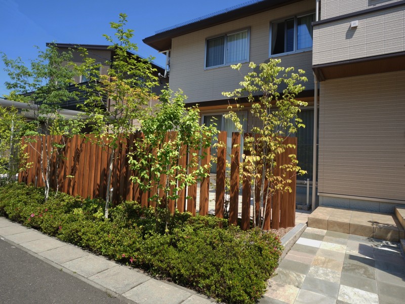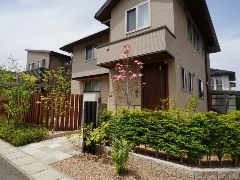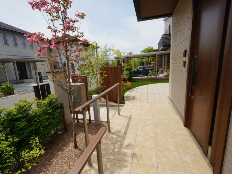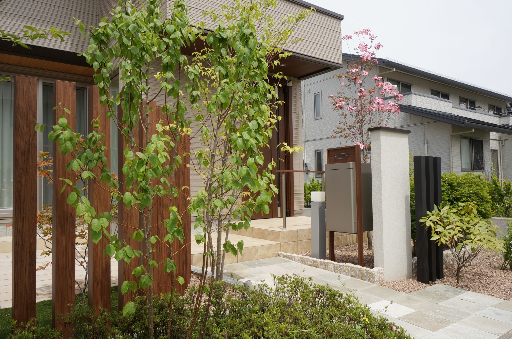 たくさんの植栽と枕木でプライベート空間をつくりながらも軽やかな印象のお庭です。四季折々の季節感を感じられるような植栽と人工芝が緑あふれる印象です。玄関前にはスマートホンと連動した宅配ボックスを設置。荷物や郵便物が届くとお知らせしてくれるスグレモノです。C様のこだわりが詰まった緑豊かでスマートなエクステリアになりました。