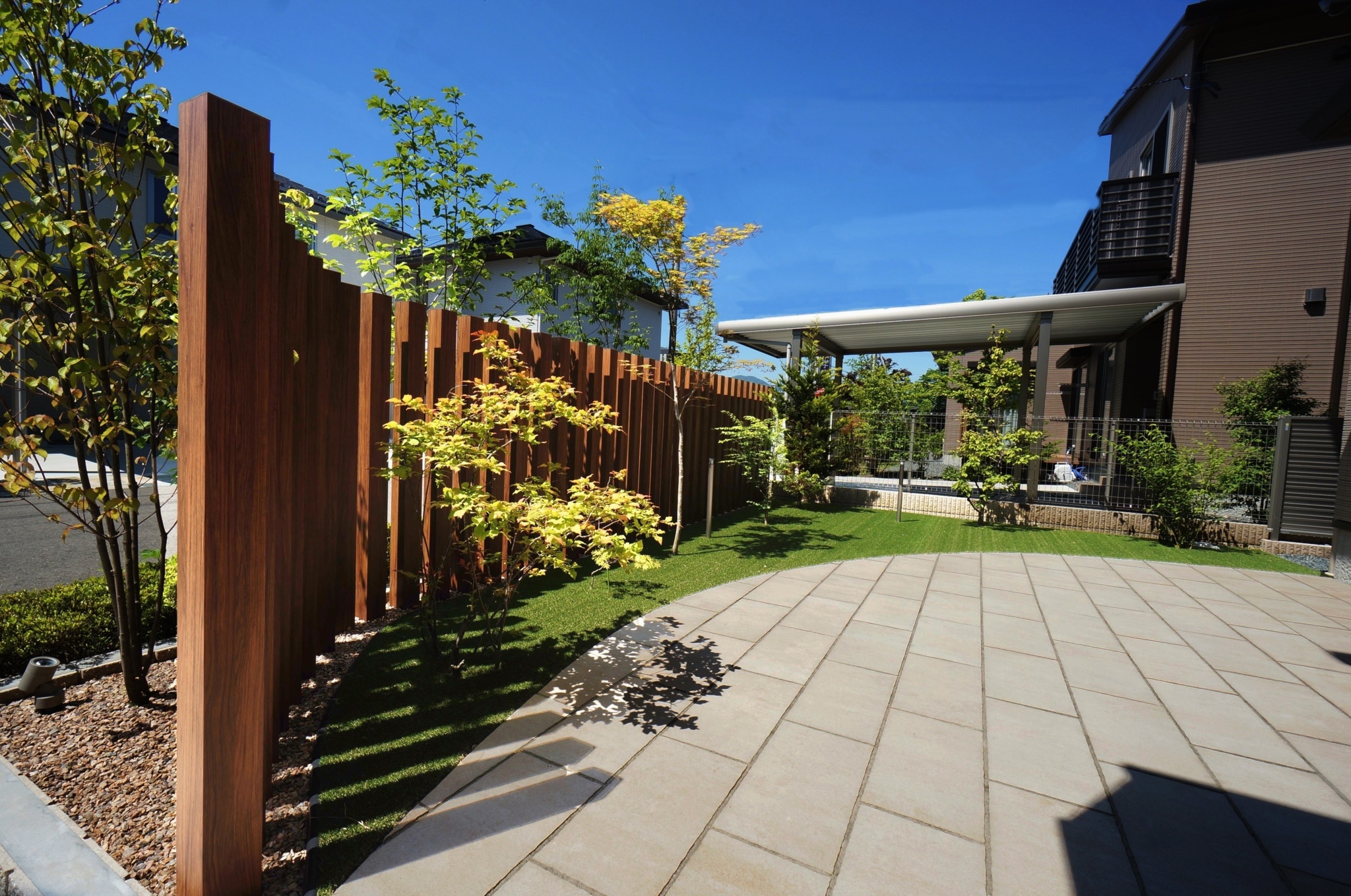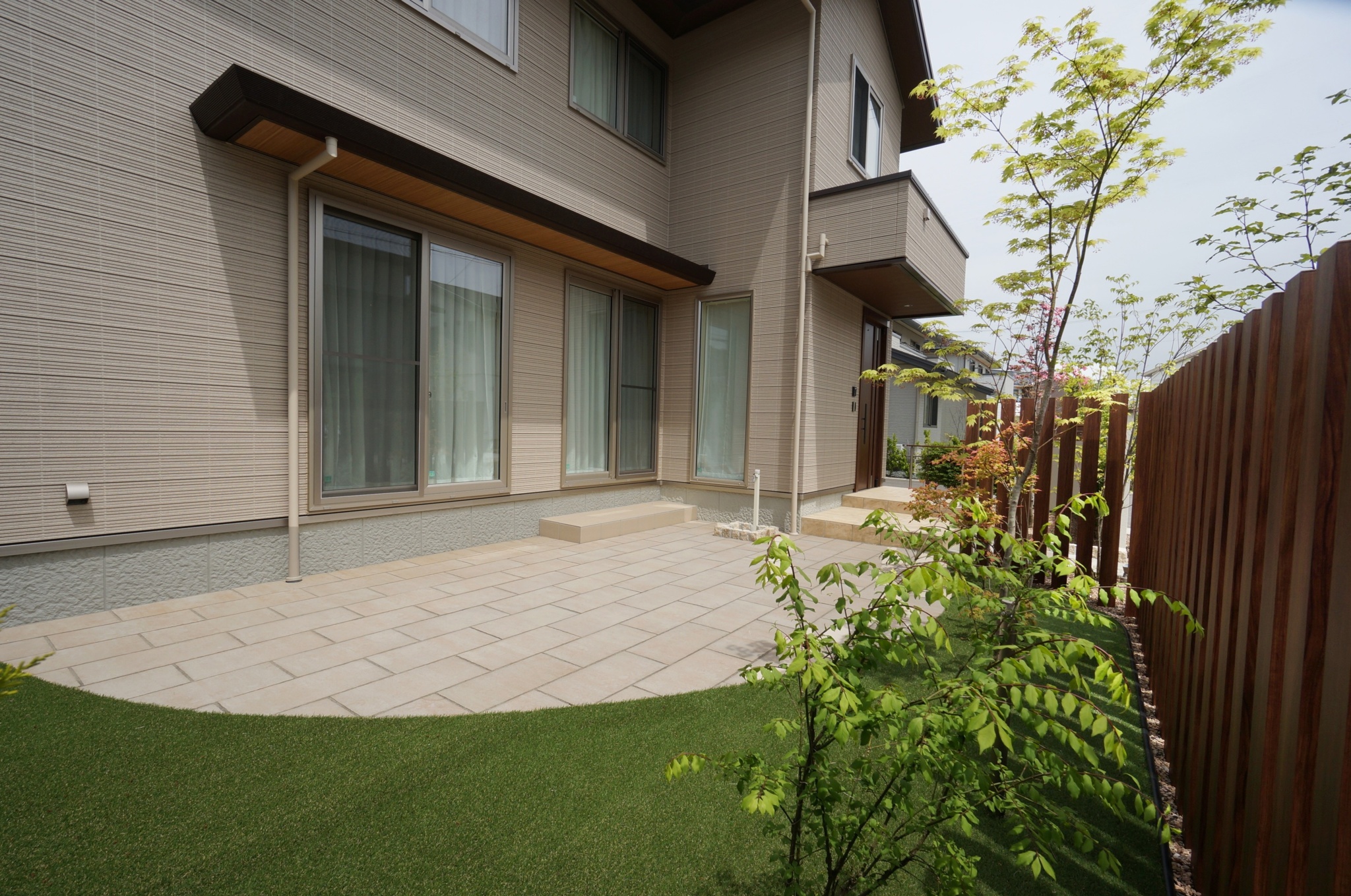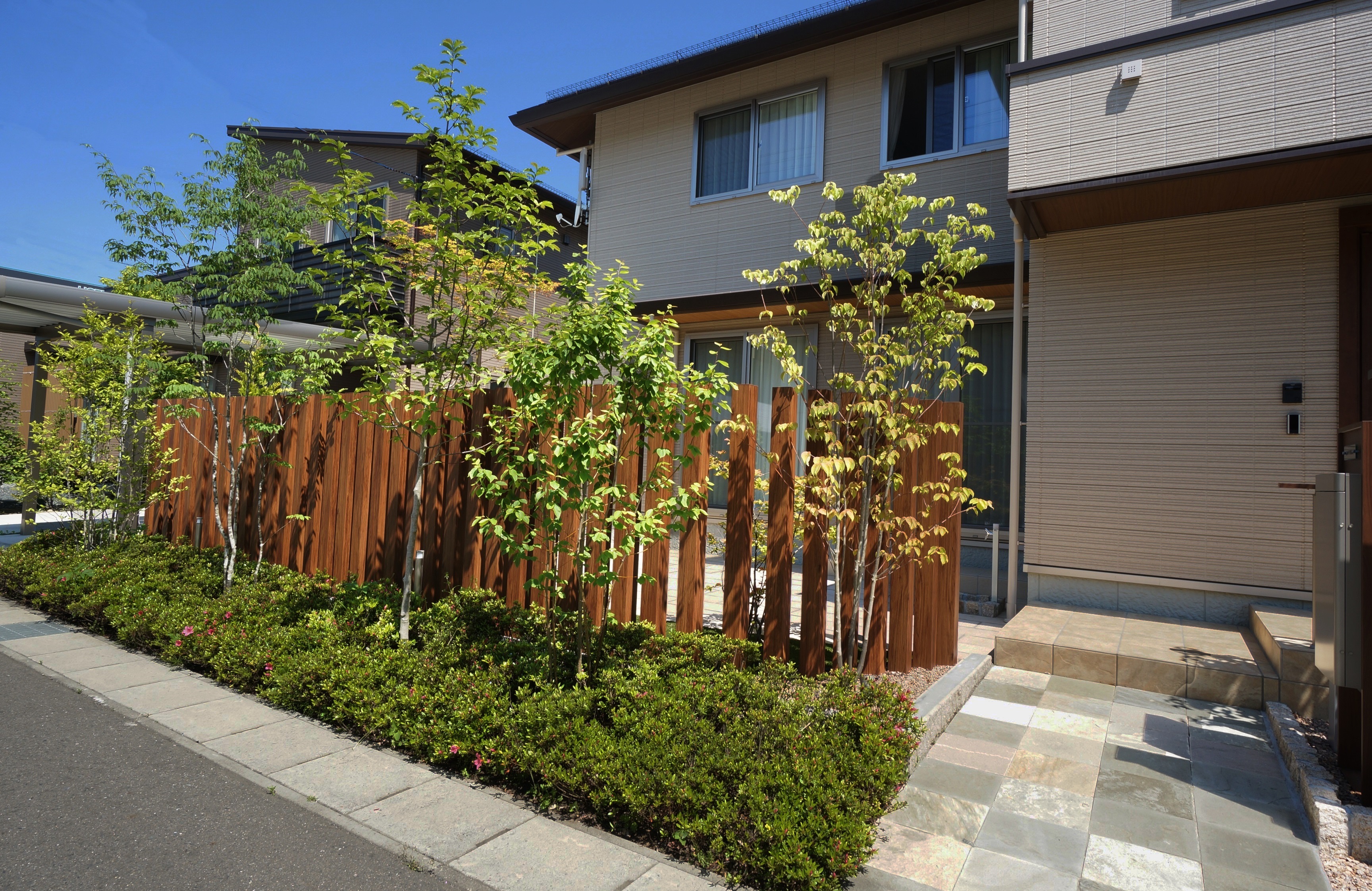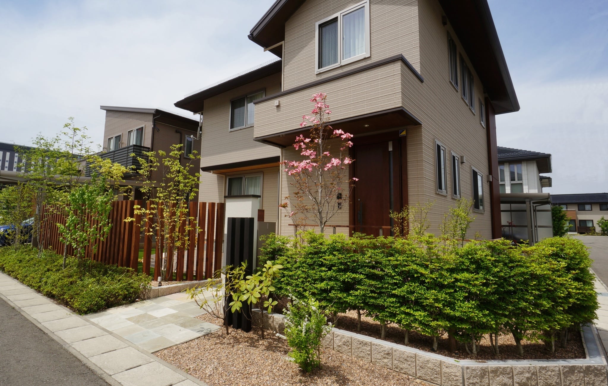たくさんの植栽と枕木でプライベート空間をつくりながらも軽やかな印象のお庭です。四季折々の季節感を感じられるような植栽と人工芝が緑あふれる印象です。玄関前にはスマートホンと連動した宅配ボックスを設置。荷物や郵便物が届くとお知らせしてくれるスグレモノです。C様のこだわりが詰まった緑豊かでスマートなエクステリアになりました。